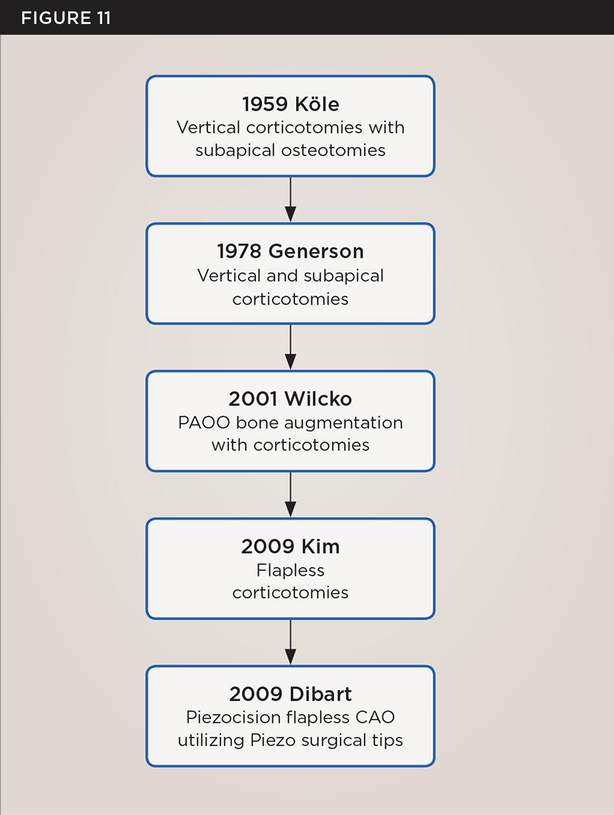As such, CAO is a surgical procedure involving selectively decorticating (perforating/removing only the cortical layer of) the alveolar bone around the roots of teeth intended to be moved orthodontically in an attempt to accelerate the tooth movement. Figure 1 through Figure 10 illustrates a case treated with corticotomy cuts and dentoalveolar decortication to accelerate orthodontic treatment. Although the primary surgical technique has undergone few changes since it was first described by Cunningham in 1898 and reported by Bichlmayr in 1931,12 the basics of understanding wound healing have become more clearly elucidated in recent years. In 1959, Kole postulated when the thickness and continuity of the dense dentoalveolar bone was disrupted, the teeth could move more freely and quicker. Hence, he made so-called “bone block” cuts in the interdental bone both buccally and lingually and joined them with a subapical osteotomy going through the entire thickness of the alveolus. The bone blocks were described as being connected only by bone marrow, allowing easy movement of the whole segment when orthodontic forces were applied. This approach became known as the bone block theory.13 Figure 11 is a flowchart demonstrating the evolution of the CAO technique since 1931.