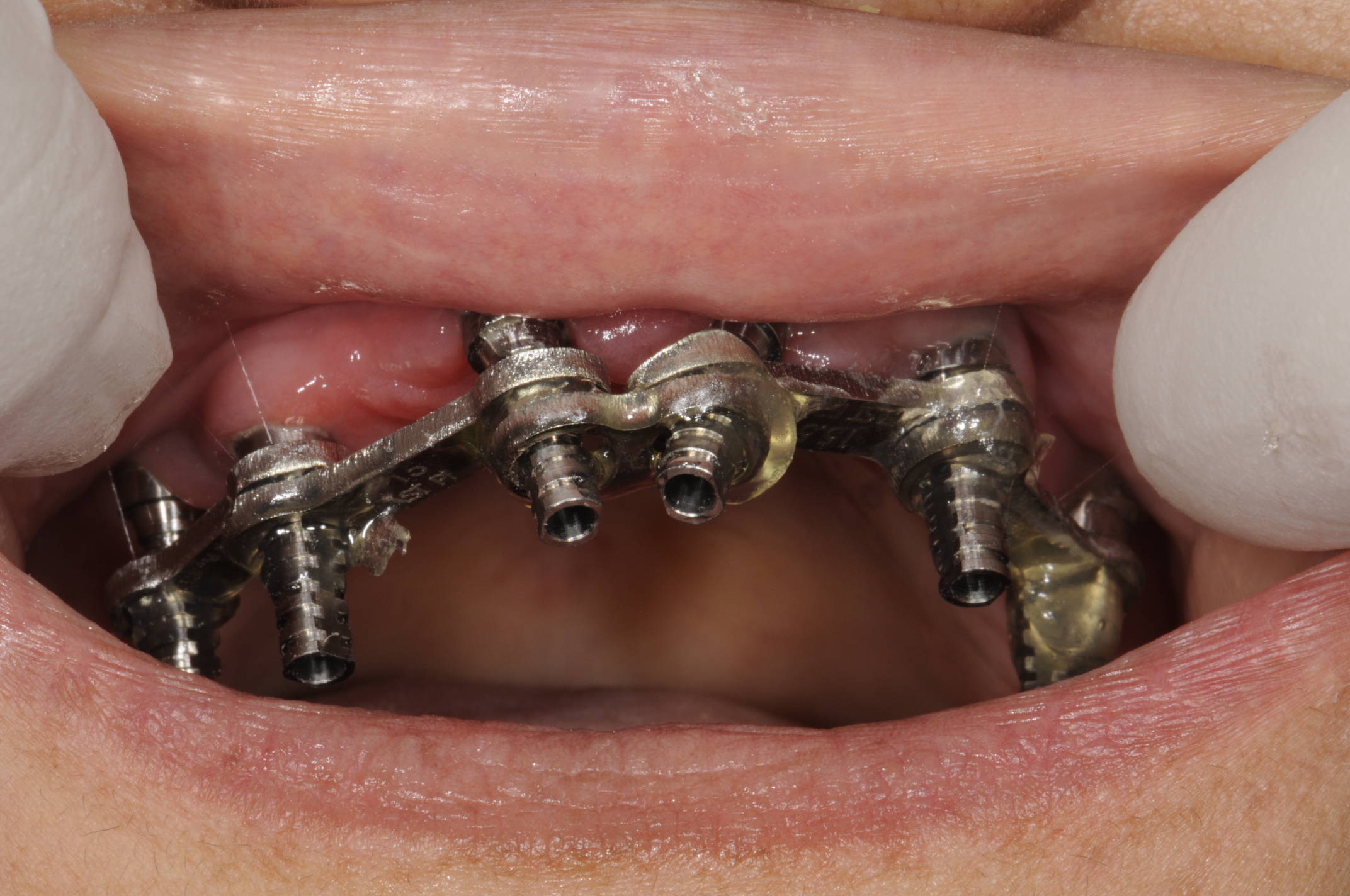 Premeasured metal bars vary in length, with premilled holes at both ends that fit over either impression copings or non-engaging abutments. A tool is provided for measuring the length needed. Once these metal bars are seated, they can be connected with either a light-cured or self-curing resin in generous amounts to ensure that movement is not possible (Figure 7). An option for a patient who has remaining existing teeth is to take an open-tray impression over the premeasured bars that have been luted into place and send that to the laboratory for fabricating an accurate master model. For a full-arch edentulous case, a flowable temporary type of material can be syringed under and over the premeasured bar, encasing the bar and capturing the impression of the tissue underneath. The bar impression is then unscrewed from the mouth and sent to the laboratory.8