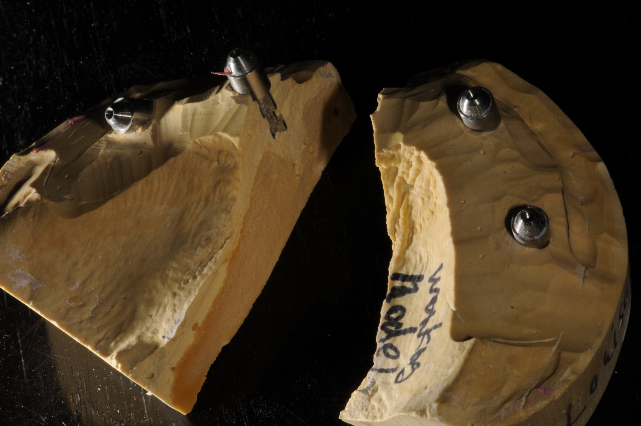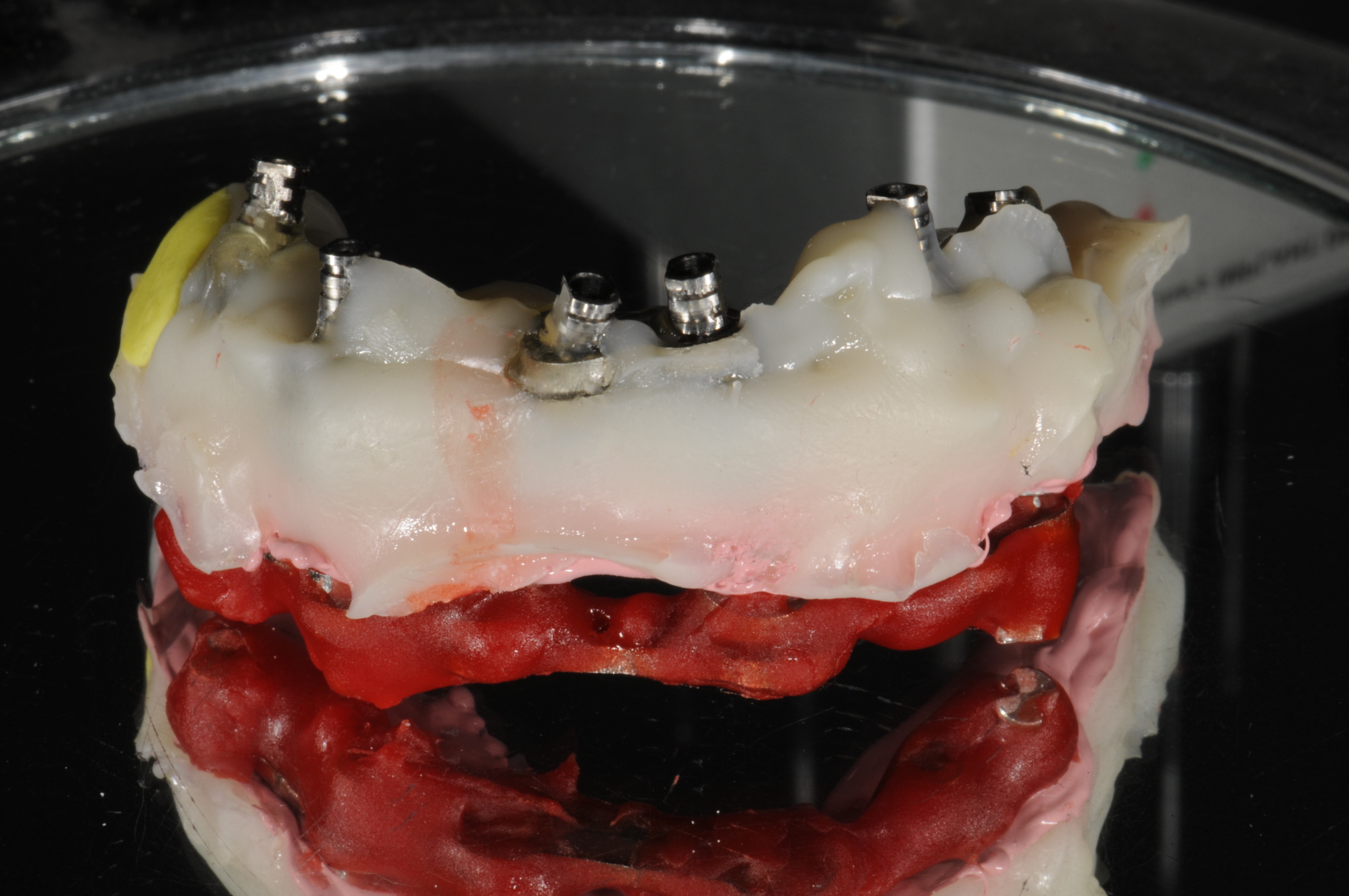 To ensure no shrinkage of the master models occurs, the laboratory will connect laboratory analogs to the impression (Figure 8) by injecting soft-tissue material first and then placing the bars and connecting with either a light-cured or acrylic resin (Figure 9). This is also to ensure no breakage occurs if the model is dropped (Figure 10). These bars also make sure that trimming the abutments will not disturb the model or destroy the plaster and lessen distortion, thereby increasing the accuracy.