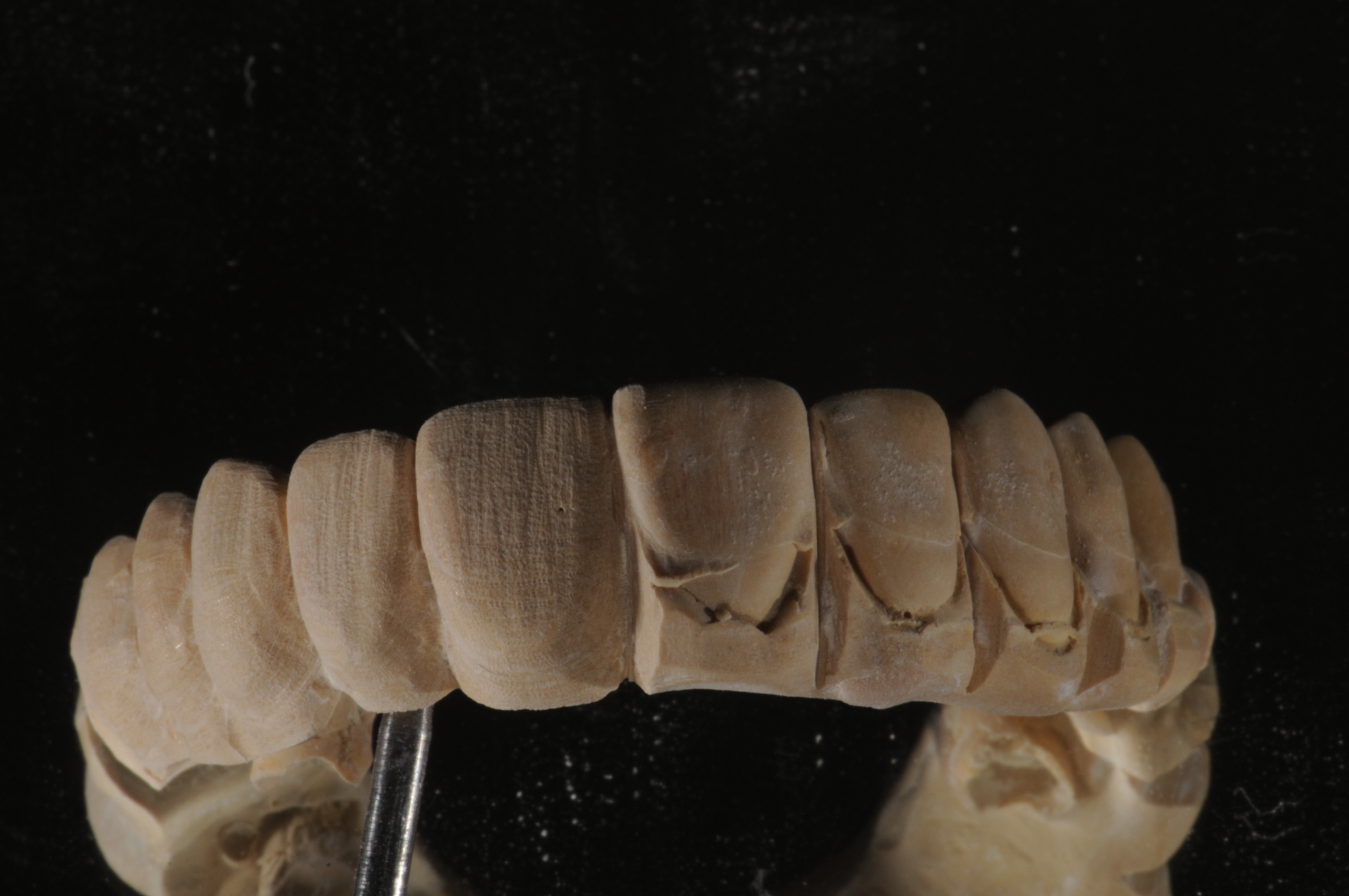 Full-monolithic zirconia is more difficult to make natural and lifelike but is definitely possible to do (Figure 17). Having a clear vision of the outcome and spending adequate time in the green stage shaping and creating definition while preserving the strength of the material is necessary. Some effects can be done after sintering using 3D stains specifically for this purpose. These stains create a silky finish and enhance the effects.