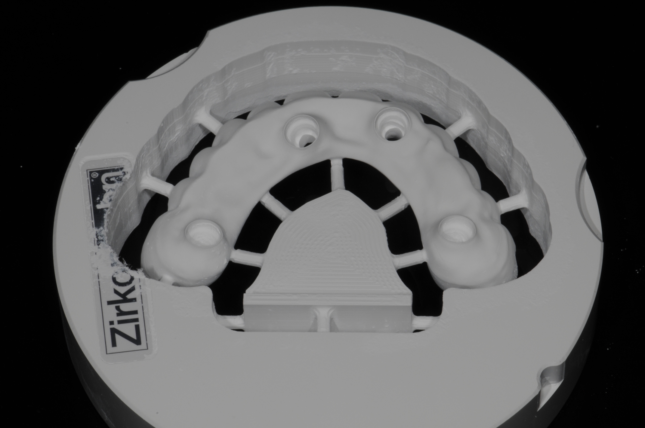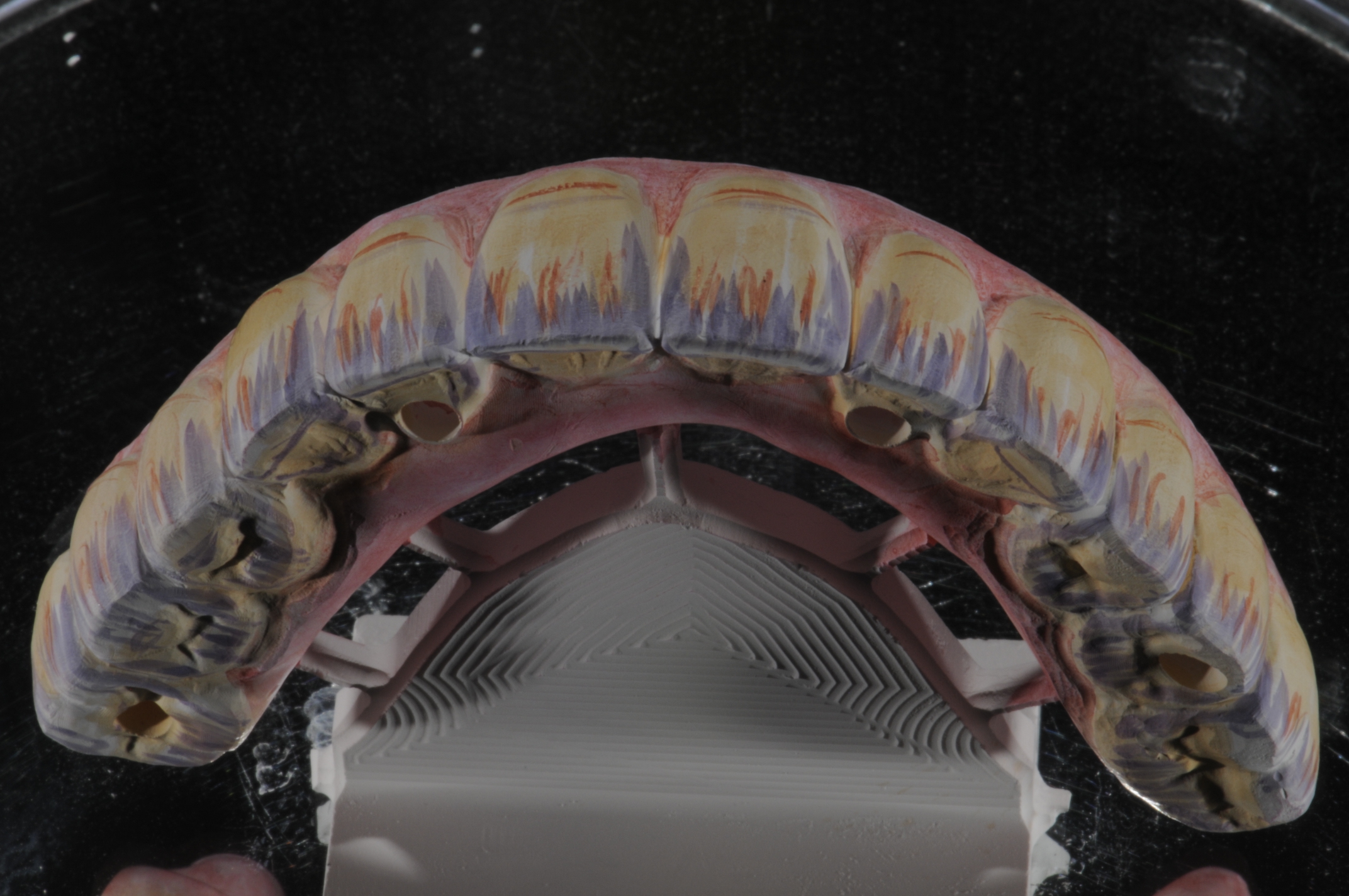 This is the stage when the intaglio-surface design needs to be determined to make sure the patient is able to floss and use a water flosser to clean the surface beneath the restoration. It is a three-dimensional restoration that the patient will wear to determine the design for optimal tissue health, proper function and occlusion, and esthetics. Once everything is confirmed in the PMMA stage, the final zirconia prosthesis should be executed. The tissue should be healed, the occlusion completely adjusted, and the esthetics confirmed; only then should the zirconia prosthesis be done. Once the PMMA is scanned and zirconia is milled, no changes should be made to the zirconia, as it will never be as polished as it is after leaving the ceramic oven. Nothing manual will ever reproduce that, and so bacteria will adhere and make cleaning the intaglio surface hard, if not impossible to do—not to mention the fact that trimming zirconia is difficult and the overheating created by it could cause breakage or microfractures that may only show themselves after the patient has been wearing the restoration.6