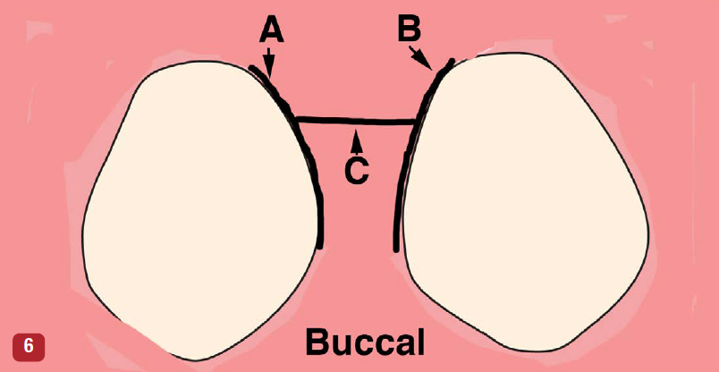 The initial VMIS incisions are usually made using either a 15c or 12d blade. A micro-blade can also be used but is not necessary. For almost all interproximal defects on natural teeth, VMIS incisions should be made on the lingual. This means that no incision or flap elevation is made on the buccal. By placing the incisions on the lingual, the esthetically sensitive buccal papilla remains undisturbed. Three separate, very small incisions are made on the lingual (Figure 6). The first two incisions are made in the sulcus of the teeth adjacent to the interproximal lesion (incisions A and B in Figure 6). No tissue, such as a collar of tissue, should be removed with these two incisions. The aim of these incisions is to sever the granulation tissue in the sulcus from the bone and connective tissue. The incisions are extended only to the level of the remaining bone. Unlike traditional incisions for resective periodontal surgery (osseous surgery), these incisions are not designed to remove the sulcular lining. The third incision (incision C in Figure 6) is placed in the base of the papilla, at least 3 to 4 mm away from the tip of the papilla. The goal of the VMIS incision pattern is to leave the col tissue and tip of the lingual papilla intact.