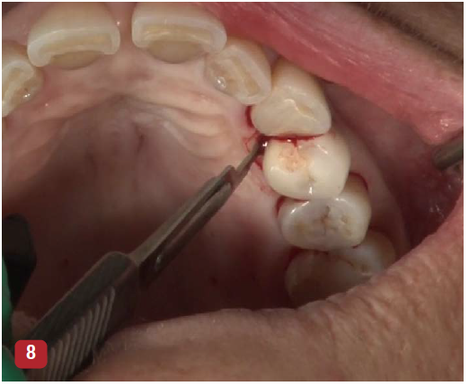 After the three initial incisions are made, the base of the papilla is reflected using a split-thickness incision. This can be performed with a sharp Orban periodontal knife or one of several tunneling knives. The incision consists of splitting the apical portion of the papillary tissue (split-thickness incision) to the crest of the remaining bone that is the edge of the osseous defect (Figure 7). The aim of using a split-thickness incision is to maintain an intact periosteum. Maintaining the periosteum will preserve a large portion of the blood supply to the gingiva. Maintaining gingival blood supply will speed healing, will minimize postsurgical pain, will help prevent postsurgical recession, and may contribute to bone regeneration. The use of a periosteal elevator should be avoided. A periosteal elevator acts to pull the periosteum off the bone, and its use is associated with increased postsurgical pain and soft-tissue recession.