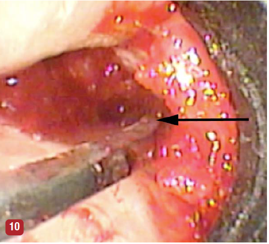 As with all periodontal surgical procedures, granulation tissue must be removed from the defect. The videoscope allows for visualization of this step using minimally invasive access. Granulation tissue removal is performed using small periodontal curettes, which can be used with the small surgical access opening, without placing undue pressure on the margins of the soft tissue. Many large surgical curettes used in routine periodontal access surgery, such as a Prichard curette, are not suitable for VMIS due to the inability to insert them into the bony defects through the small VMIS access incisions. Either a Younger-Goode 7/8 used in a manner similar to a spoon for caries (Figure 10) or a small Gracey curette is generally chosen because their small size allows them to access the periodontal defect using the small VMIS surgical access incisions.
