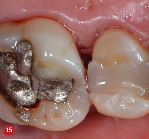 Many types of regeneration material have been used with VMIS. The published university-based studies of VMIS on natural teeth have used the protocol and materials described here.8-12Demineralized freeze-dried bone allograft (DFDBA) mixed with enamel matrix derivative (EMD) is placed in the defect after debridement. According to the manufacturer's instructions, the cleaned root surface is dried and EMD is placed on the root or implant. The DFDBA is first moistened with a saline solution for several minutes before adding the EMD. The DFDBA is placed in a container and then blotted with sterile gauze to remove excess saline. At that point a small amount of EMD is added to the moistened DFDBA. The DFDBA/EMD mixture is then placed into the debrided defect (Figure 14). Care should be taken to not place too much bone in the defect. Overfilling the defect with bone can make it difficult to obtain primary soft-tissue closure of the lesion.