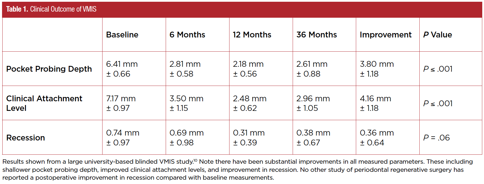 The 3- to 5-year findings from a large university-based study of VMIS on natural teeth showed excellent and predictable results.10At 36 months postoperative, the mean pocket probing depth of surgical sites was 2.73 mm and the mean clinical attachment was 2.94 mm. Of the 110 sites in 30 patients, all surgical sites had pocket postsurgical probing depths of less than 4 mm. Unlike other periodontal regenerative surgery reports that show some postsurgical recession,15 VMIS showed no mean postsurgical recession and actually showed an improvement in soft-tissue height of 0.49 mm. An improvement in recession after periodontal regenerative surgery has not been reported with any other periodontal regenerative surgical techniques. Clinical results at 6 months, 12 months, and 36 months are shown in Table 1.