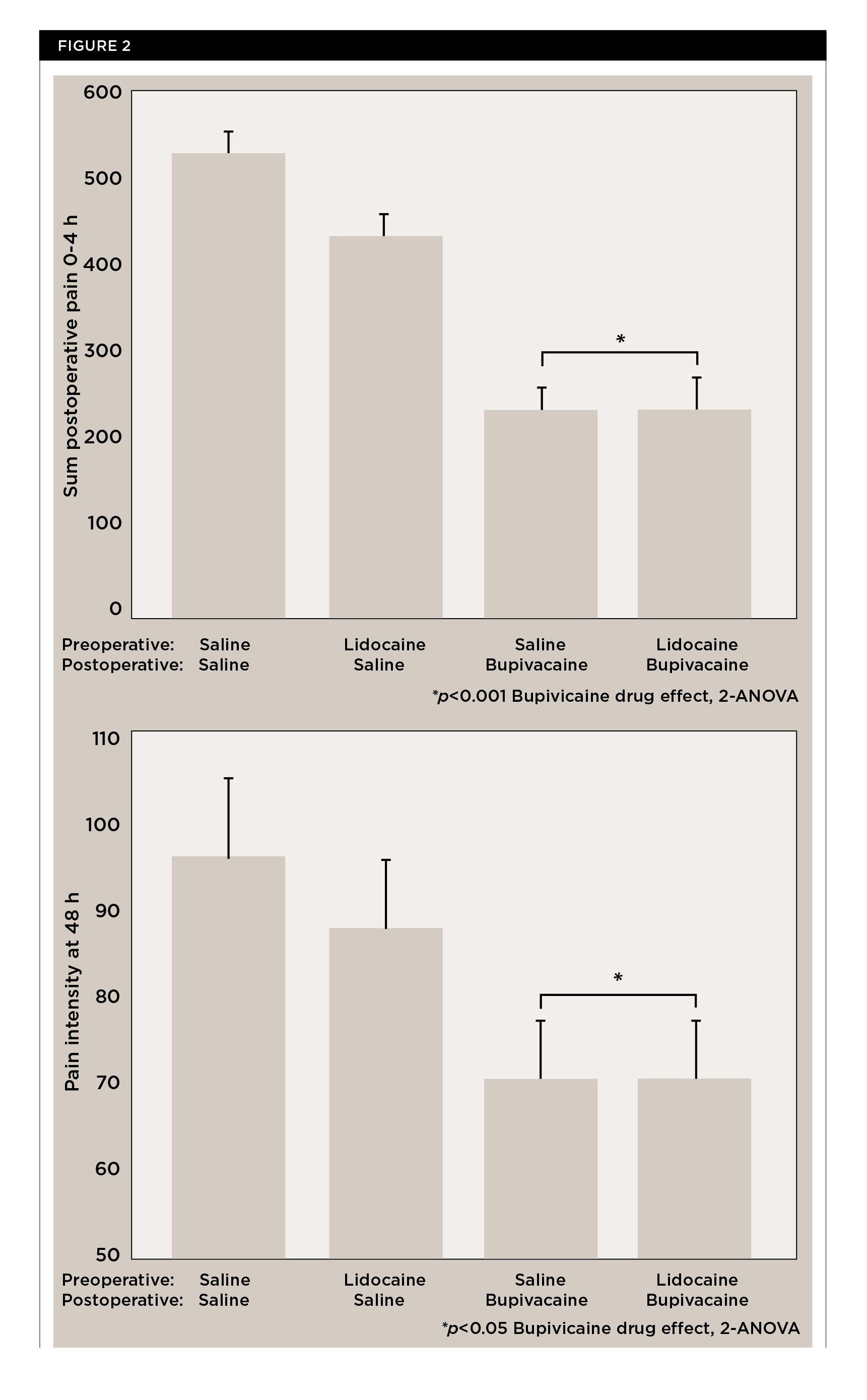 The administration of the long-acting local anesthetic 0.5% bupivacaine plus 1:200,000 epinephrine at the end of a procedure can reduce pain scores for up to 48 hours postoperatively. A reduction in postoperative pain will result in less analgesic consumption, fewer drug-specific side effects, and potentially less exposure to opioids. In a study by Gordon et al of patients who had their third molars removed under general anesthesia, pain scores were reduced for 48 hours if the long-acting local anesthetic solution of 0.5% bupivacaine plus 1:200,000 epinephrine was administered immediately postoperatively compared with patients who were not given this regimen (Figure 2).33 It is thought that the long-acting bupivacaine reduces the afferent barrage of nociceptive input and prevents central sensitization to pain; the benefit of long-acting local anesthetic is still significant at 48 hours even though the local anesthetic will have worn off.27-29