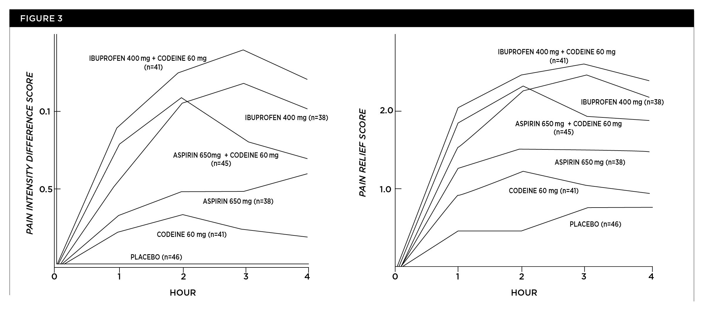 Analgesic studies have demonstrated the efficacy of NSAIDs in the management of moderate to severe postoperative dental pain. They have included use of the Dental Impaction Pain Model, one of the most widely used acute pain models.46Much of these data have been available since the early 1980s, which only serves to heighten the tragedy of the role of dental prescribing practices in the opioid epidemic.3 Hundreds of trials involving thousands of patients illustrate the data summarized in Figure 347 and justify the prescribing regimens in Figure 1.27,28 Cooper et al demonstrated that ibuprofen 400 mg has superior analgesic efficacy to aspirin 650 mg plus codeine 60 mg, followed by aspirin 650 mg, which was better than codeine 60 mg, and lastly placebo (Figure 3).47 These data originated from a 1982 trial in which aspirin was used. However, acetaminophen can be logically substituted for aspirin because it has been demonstrated that acetaminophen, although lacking anti-inflammatory activity, is equianalgesic to aspirin: 650 mg of acetaminophen will produce equivalent analgesic to 650 mg of aspirin.48