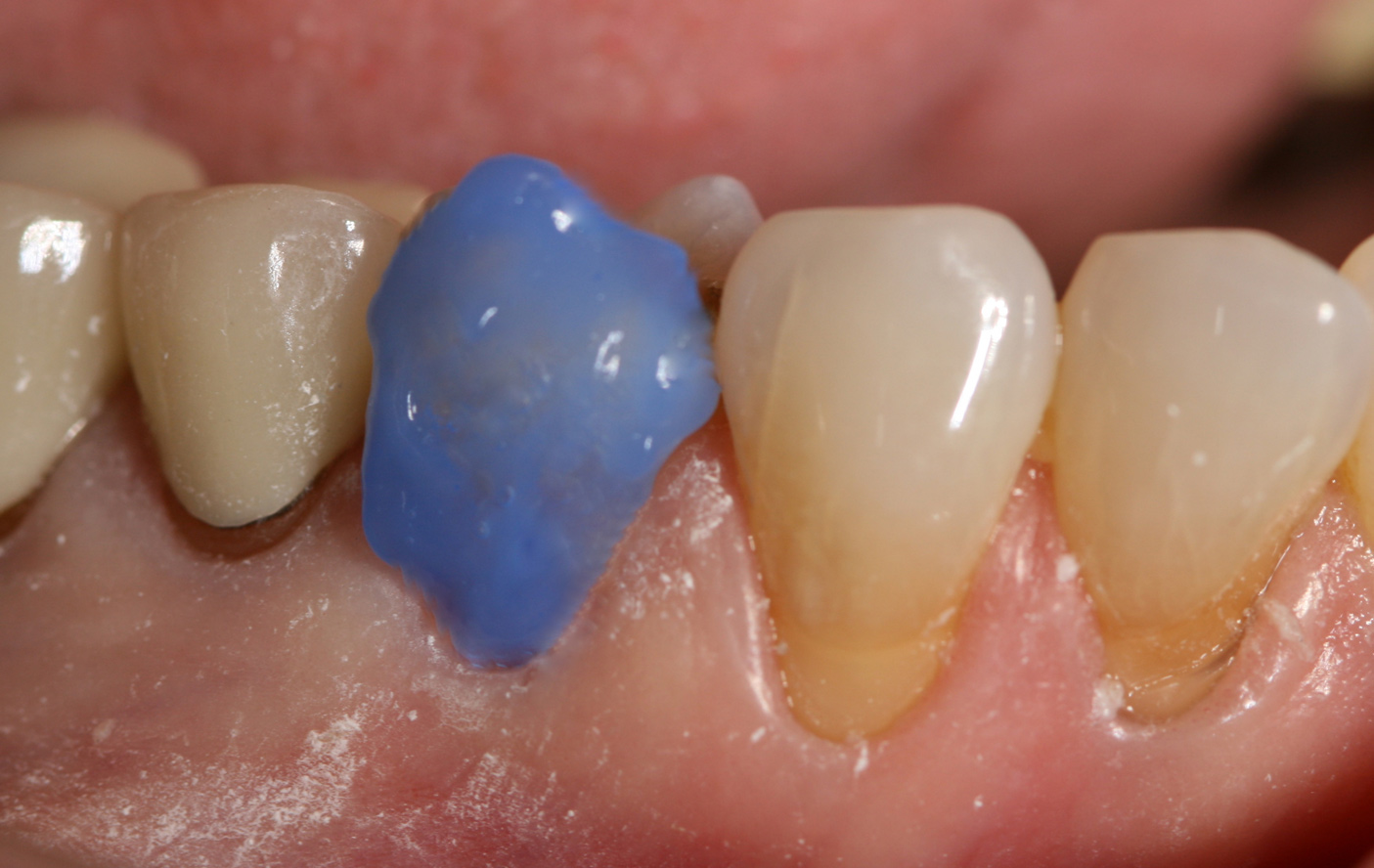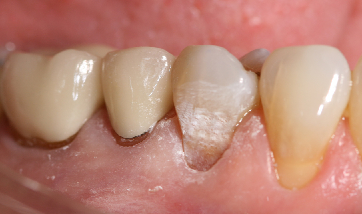 The final image (Figure 13) shows the last step, using varnish (Profluorid®, VOCO) as a fluoride sealer in case any root surfaces were exposed during the restoration. MI Varnish® by GC America, Embrace™ by Pulpdent, and Clinpro™ 5000 by 3M are examples of other varnishes that would work. These varnishes act as a fluoride bandage to prevent any transient sensitivity issues. Dentin sensitivity issues are not limited to recently restored teeth; discomfort from dentin sensitivity is a common finding in adult populations, with available prevalence data ranging from 8% to 57%.40,41 Through the deposition of calcium fluoride on the tooth surface and with the formation of fluoroapatite, the dental tubules are completely sealed to promote a secondary dentin surface.42 The restoration is now complete.