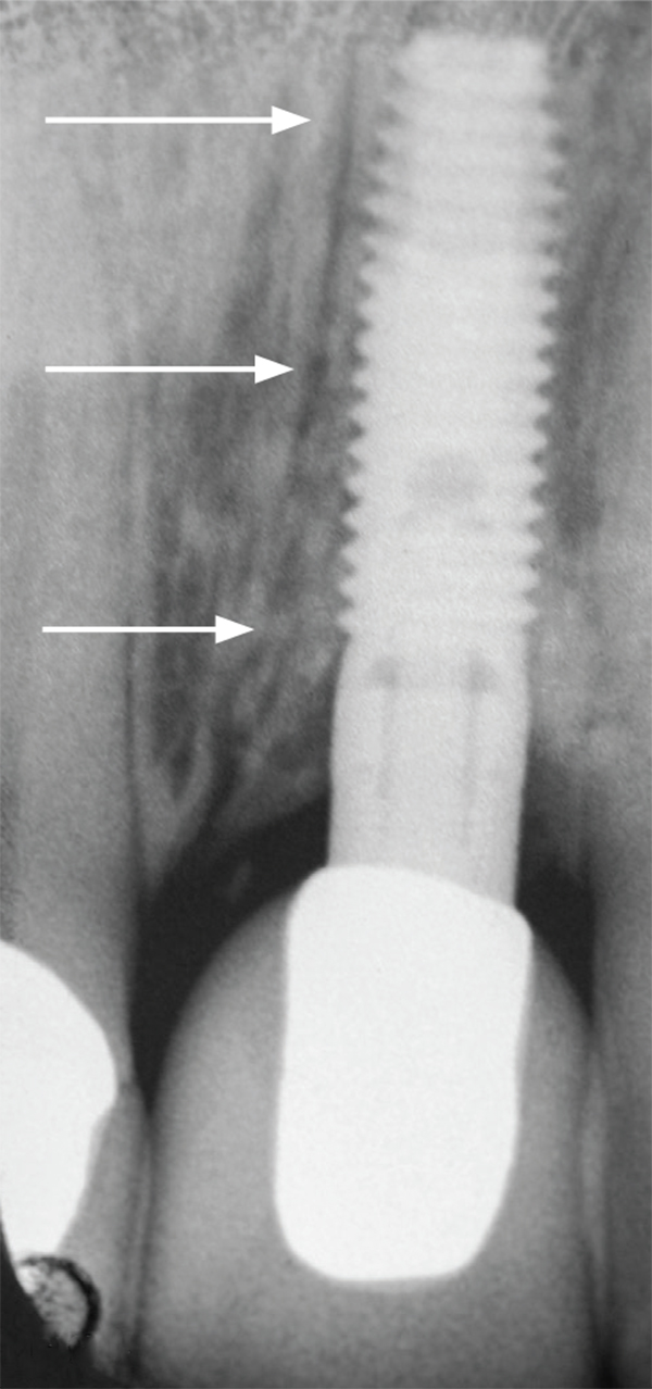 Peñarrocha et al21 assessed the survival rate of implants placed into the nasopalatine canal in patients who underwent rehabilitation of their atrophic maxilla. The nasopalatine canal was enucleated before implant placement and no concurrent bone grafting was performed. They monitored 13 implants placed in the incisive canal over a 9-year period. Six patients indicated they had a slight decrease in sensitivity in the anterior part of the palate that resolved within a few weeks. Two early failures before prosthetic loading were noted. Similarly, Spin-Neto et al22 reported successful placement of an implant into the canal without concurrent bone grafting (N = 1) (Figure 3).