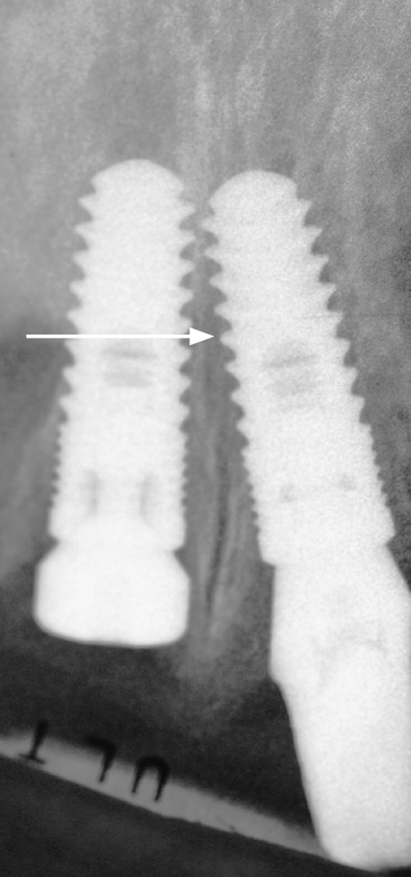 If an osteotomy is created that inadvertently results in a large perforation into the nasopalatine canal, then the contents of the canal should be removed.13 Subsequently, the implant should be inserted, and if a significant gap exists around the implant, it should be filled with bone graft material. In general, an implant should not be left in contact with soft tissue as this may interfere with osseointegration.13,14 If, however, a small mid-canal fenestration is accidentally created when preparing the osteotomy, it may go unnoticed and have little clinical effect (Figure 2).
