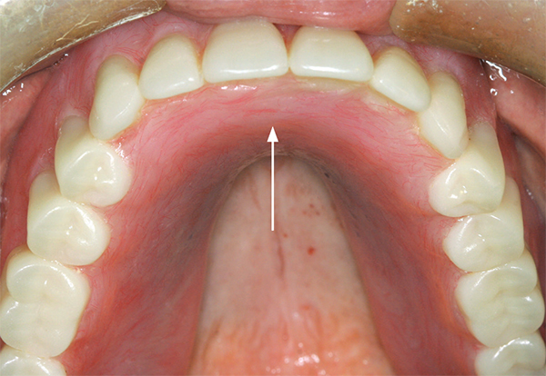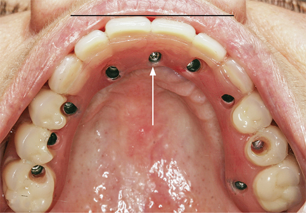 At first glance, it might be presumed that lingual implant placement in the nasopalatine canal may contribute to a fixed prosthesis extending too far palatally, thereby compromising phonetics. However, this assumption is not always true. The location of the implant can accommodate a screw-down fixed prosthesis. In general, when a screw-down prosthesis is constructed in the maxillary anterior region, it is desirable to have a horizontal disparity of 5 mm to 7 mm between the placement of the implant’s platform and the facial of the prosthetic tooth to be restored. This horizontal mismatch accommodates the required prosthetic components and a prosthetic tooth (Figure 6). Accordingly, the labial aspect of the prosthesis will be in correct position to provide excellent esthetics. Concerning intraoral comfort, a patient may perceive a slight elevation of the prosthesis on the palatal aspect, coincidental with the site of implant placement; however, compared to a denture, the patients can tolerate this minor protuberance. Conversely, if a removable prosthetic appliance is fabricated, a low-level unsplinted attachment can be used to minimize the acrylic height on the lingual aspect of the prosthesis (Figure 7).