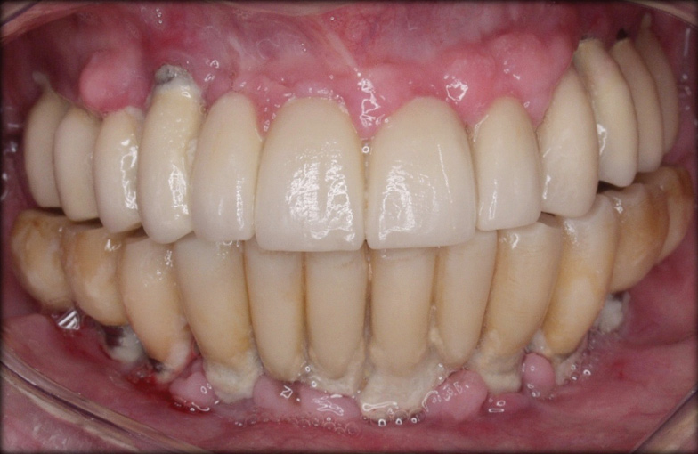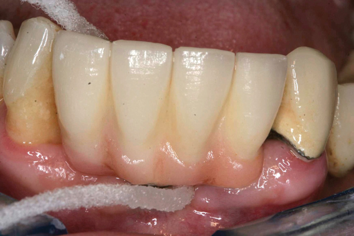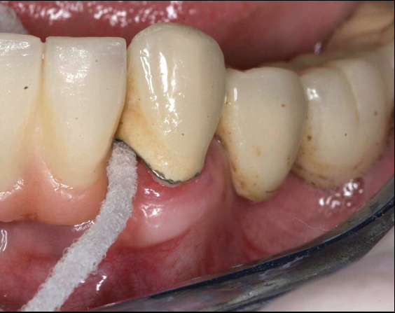 An important aspect of both professionally and patient-administered plaque removal is the cleanliness of the implant-supported restoration. A cohort study on 23 patients demonstrated that 74% of implants had no accessibility to proper oral hygiene and 48% of implants presenting with peri-implantitis were those that were not cleansable.17 The non-fitting or non-cleansable overhanging prostheses, therefore, should be considered iatrogenic factors that contribute to the development of peri-implantitis. Similarly, incorrectly positioned implants or foreign bodies such as impression material or excess luting cement can contribute to increased biofilm accumulation and hence favor the development of peri-implant diseases.10 Correction or elimination of these factors (eg, prosthesis removal and adjustment/replacement, if necessary) should be a principal component of the treatment of peri-implant mucositis (Figure 9 through Figure 11).