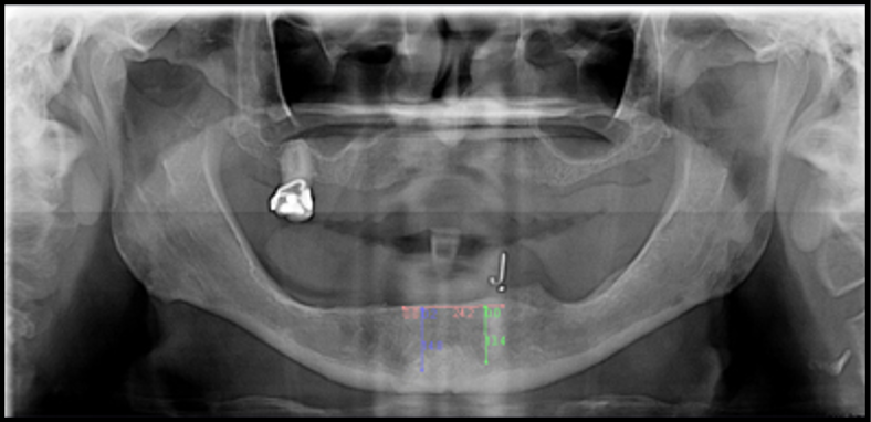 Traditionally, panoramic radiographs/2D images were used for planning the position of implants.22 The patient's existing denture or a duplicate of the existing denture was used as a radiographic guide (by incorporating radiographic markers), and then the denture or duplicate was converted to a surgical guide (Figure 2) and used for placing implants.23 Much information about the dentition, jaws, and joints may be acquired with a small amount of radiation dose from panoramic radiographs (Figure 3).24 However, the panoramic i ages are distorted and magnified. Patient positioning and technical errors further affect the image accuracy.25 It is almost impossible to determine the available bone width and the exact relationships of the neighboring anatomical structures with 2D radiographic images.25,263D radiography provides more accurate representation of the available bone and the surrounding anatomic structures compared with 2D radiography.27 It is critical to assess the position of the inferior alveolar nerve/sinuses while planning the location of implants to prevent injury to vital anatomic structures.28