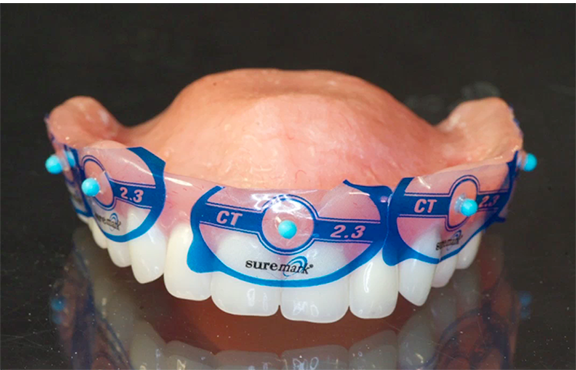 The use of CBCT (3D radiography) for presurgical planning of implants has made a huge impact on the success of implants and implant restorations.27 A dual-scan protocol is generally used.29 Radiographic markers are placed on the denture (Figure 4).29 A scan is made of the patient wearing the denture, and another scan is made of the denture itself. The data from the two scans are merged to optimally plan implant locations. 3D technology also permits the practitioner to perform an intraoral scan and merge the files acquired from the CBCT scan with those acquired from the intraoral scan (Figure 5).30 The detailed information provided with 3D technology permits the most accurate diagnosis and treatment planning.31 The planning data are sent to the production facility to generate 3D surgical guides.31