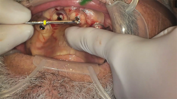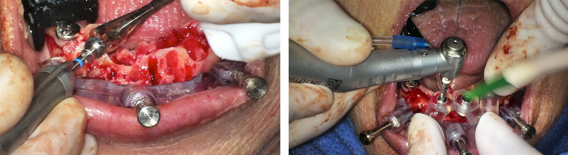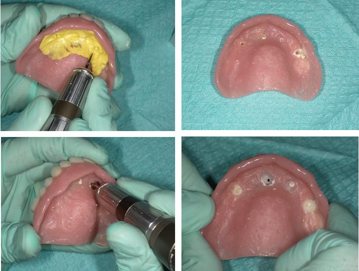 Pilot drill osteotomies were performed using the surgical guide46 (Figure 10), subsequent osteotomies were performed freehand, and the implants were placed as planned in the maxillary arch. A laser or a tissue punch can be used for removing the excess tissue to place healing abutments. The transitional maxillary digital denture was relieved around the implants, and a soft liner was placed on the intaglio surface of the prosthesis.