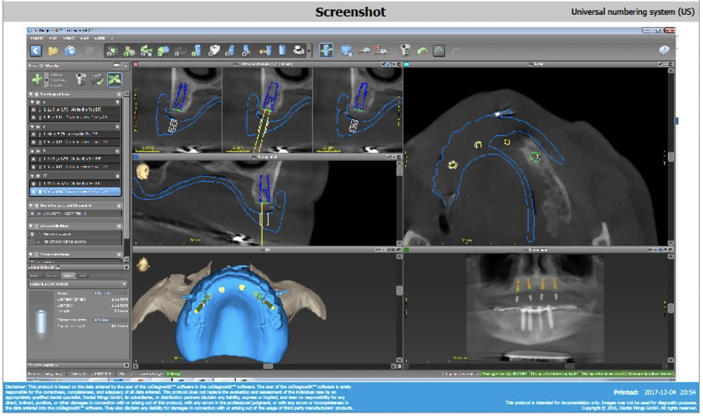A dual scan protocol was used.29 The implant planning was accomplished on the implant-planning software (Figure 9).29,45The maxillary prosthesis was outlined (blue in the scan) to enable easy identification of the position of the denture and the prosthetic teeth. Four implants were planned, not only based on the available bone but also on the position of the prosthetic teeth, while maintaining the recommended distance from the maxillary sinuses. A surgical guide was ordered for guiding the pilot drills.46