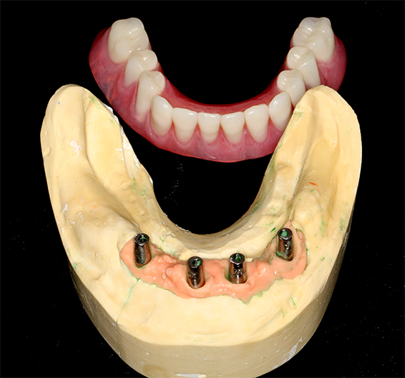 An implant-retained and implant-supported removable prosthesis may be fabricated by using a bar or a conical, titanium abutment with a 5-degree taper (Figure 18).49 In the next case, a fixture-level impression was made and records were registered and sent to the laboratory with the abutments (preselected based on the height of the mucosal cuff) for framework and prosthesis fabrication.49 The prosthesis had recesses on its intaglio surface to permit pickup of the abutment caps (Figure 19).49 The abutments were attached to the implants in the mouth (Figure 20). A jig/index provided by the laboratory (Figure 21) was used to seat the abutments intraorally so that they were positioned exactly as they were on the master cast. Gold caps were placed over the abutments and were picked up in the prosthesis intraorally (Figure 22).49 (Gold caps that fit over the abutments provide excellent retention, which improves over time.)50 The prosthesis was adjusted, finished, polished, and placed in the mouth (Figure 23). The prosthesis was entirely supported by the implant abutments.49 It had excellent retention and stability (almost like a fixed restoration) because it was entirely implant-supported; yet, it was removable.49