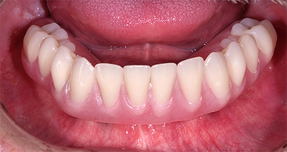 Figure 24 through Figure 31 depict a case of an elderly patient rehabilitated with a mandibular CAD/CAM full-arch fixed zirconia restoration.51 The patient had a removable partial denture in the mandibular arch; the remaining mandibular teeth were deemed non-restorable and had to be removed. A transitional complete denture was fabricated for the patient; however, he was not pleased with it because of the poor retention, masticatory efficiency, and function. The patient was treatment planned for an implant-supported mandibular restoration.