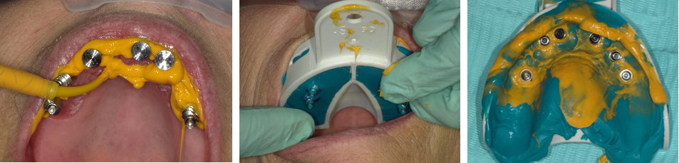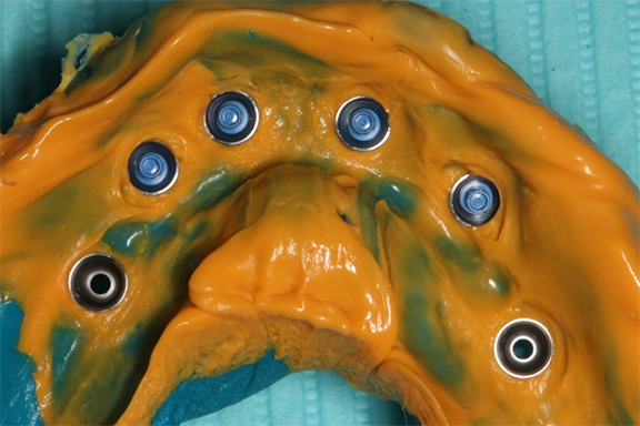 Impression copings were attached to the abutments (Figure 25); an abutment-level impression was made (Figure 26), and records were registered and sent to the laboratory for fabrication of the definitive prosthesis. A CAD/CAM all-zirconia prosthesis was planned (Figure 27, left) and fabricated by the laboratory. The prosthesis would have recesses on its intaglio surface in the location of the four anterior implants to provide space for the pickup of the attachment housings (Figure 27, right).41