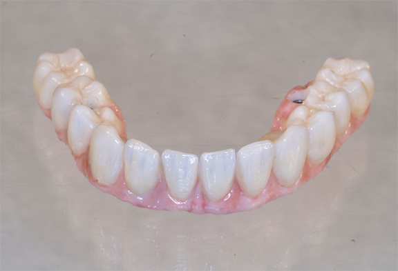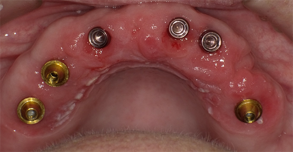 The denture attachment housings were placed over the four anterior abutments (Figure 28).41 The prosthesis (Figure 29) was tried and adjusted as needed, and the occlusal vertical dimension was verified.41 Block-out rings were placed around the abutments in the mouth to block out the undercuts below the abutments.41 Attachment pickup material was placed around the four anterior abutments in the mouth and in the recesses of the prosthesis, and the prosthesis was placed in the mouth.41 It was attached posteriorly to the distal-most implants with screws. After the polymerization of the pickup material, the screws of the multiunit abutments were loosened, and the prosthesis was removed from the mouth. The denture attachment housings were picked up in the zirconia prosthesis (Figure 30).41 The black nylon processing inserts present within the attachment housings were removed and replaced with new ones.41 The prosthesis was adjusted, finished, and polished. Then the black inserts were replaced with the retentive inserts.41 The amount of retention can be increased by using inserts that provide an added degree of retention, if needed.41 The prosthesis was placed in the patient's mouth, and the distal screws used to attach the multiunit abutments to the prosthesis were tightened and torqued per the manufacturer's recommendation (Figure 31). The screw-access holes were packed with polytetrafluoroethylene and composite resin.