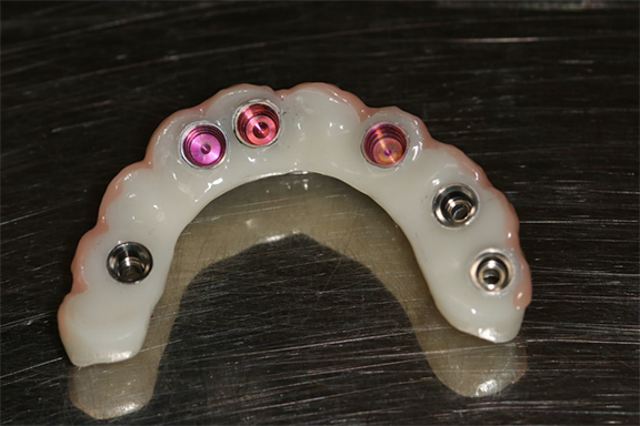 A fixed all-zirconia combination screw- and abutment-retained prosthesis was planned for the mandibular arch. Multiunit abutments were used to correct the angulation of the tilted distal implants54 and were torqued per the manufacturer specifications. Novel retentive abutments that would preclude the need for screws and cements were attached to the four anterior implants, rotated to ensure they were parallel to each other, and torqued per the manufacturer specifications (Figure 24).41