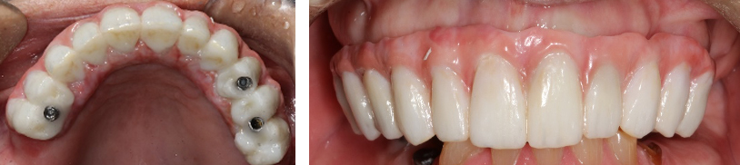 In the case depicted in Figure 8, the patient was restored with implant- and mucosa-supported digital overdentures.44 The patient approached the practitioner with a transitional implant-supported mandibular overdenture and a maxillary complete denture. The mandibular prosthesis had fractured a few months earlier and the patient had used commercially available adhesive to keep the fractured segments together. The patient desired an implant-supported restoration for the maxilla. A new mandibular prosthesis was also indicated to permit the development of optimal occlusion and proper positioning of the maxillary and mandibular prosthetic teeth.44 Digital dentures were fabricated for the patient and placed in the patient's mouth. To further improve the esthetics and occlusion, the prosthetic teeth that were incorporated in the digital dentures were ground down and replaced with acrylic teeth in wax. The acrylic teeth were repositioned to achieve optimal esthetics and function. The trial dentures with acrylic teeth were scanned, and the subsequent set of digital dentures was used as a transitional restoration and for planning maxillary implant positions.