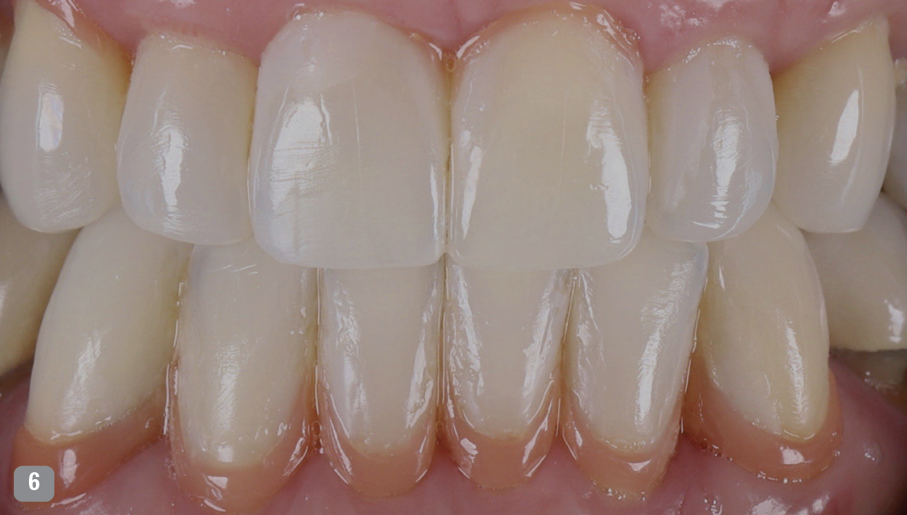 The patient did not want the latter options, but was amenable to composite boding. Periodontal splinting in conjunction with bonding is called for in some cases-when there are not good interproximal contacts, when the maxillary and/or mandibular teeth are loaded in different dimensions, and when they have diastemas.4-10 Obviously, the teeth can move because of decreased periodontal support. However, when the diastema is decreased, the periodontium stabilizes, which has to do with the bioactivity of the Giomer Technology materials.2,11-14 Some of these cases still need to be splinted.