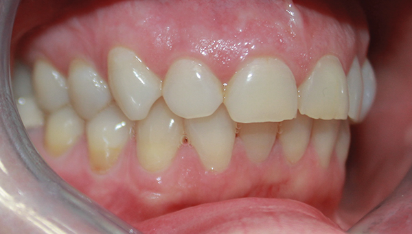 Gastric reflux, whether voluntary or involuntary, can be very destructive to tooth structure. During an intraoral examination, several factors can suggest to the clinician an active or past presence of GERD. Much like most extrinsic cases of erosion (from GERD or bulimia), the wear presents as smooth lingual surfaces of the maxillary anterior teeth and flattened occlusal surfaces of mandibular posterior molars.8 This erosive wear evolves over time and destroys the enamel except along the gingival margin, giving the teeth a darker hue.9 As the lingual surfaces of the maxillary teeth begin to erode, the teeth often respond by undergoing dentoalveolar extrusion.10 This process needs to be identified and diagnosed appropriately when proceeding with a smile design change to achieve an ideal cosmetic result. In this patient's case, dentoalveolar extrusion of the maxillary anterior teeth was diagnosed as a secondary condition resulting from the long-standing reflux condition.