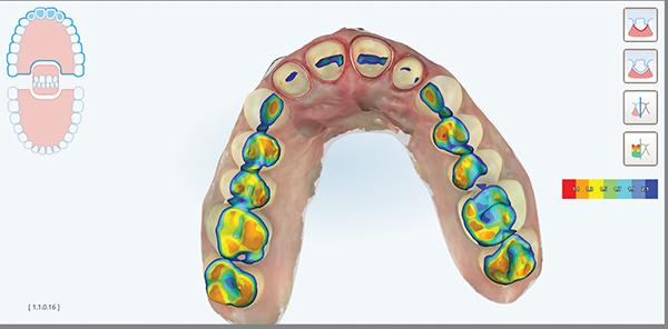 Digital impressions are an effective alternative to conventional impression techniques and may be considered as the first option for impression-taking because of predictable, efficient, and simplified processes for both patients and clinicians.18 Using an intraoral scanner, such as the iTero Element 2 used in this case, affords the clinician many efficiencies that cannot be achieved with traditional polyvinyl siloxane (PVS) impression materials. Preparations can be reviewed and verified, including marginal clarity and restorative clearance, while the patient is still in the office. With a digital platform such as MyiTero (Align Technology, Inc.) or other comparable software, clinicians can quickly assess the quality of their preparations, marginal design, marginal visualization, and clearance between arches, as shown in Figure 11 and Figure 12, which are additional digital images of the preparations in this case. If any areas require modification, the clinician can complete those steps and rescan the areas as needed without having to reappoint the patient. Digital impressions also provide a permanent record storage of the case which can be revisited at any time.