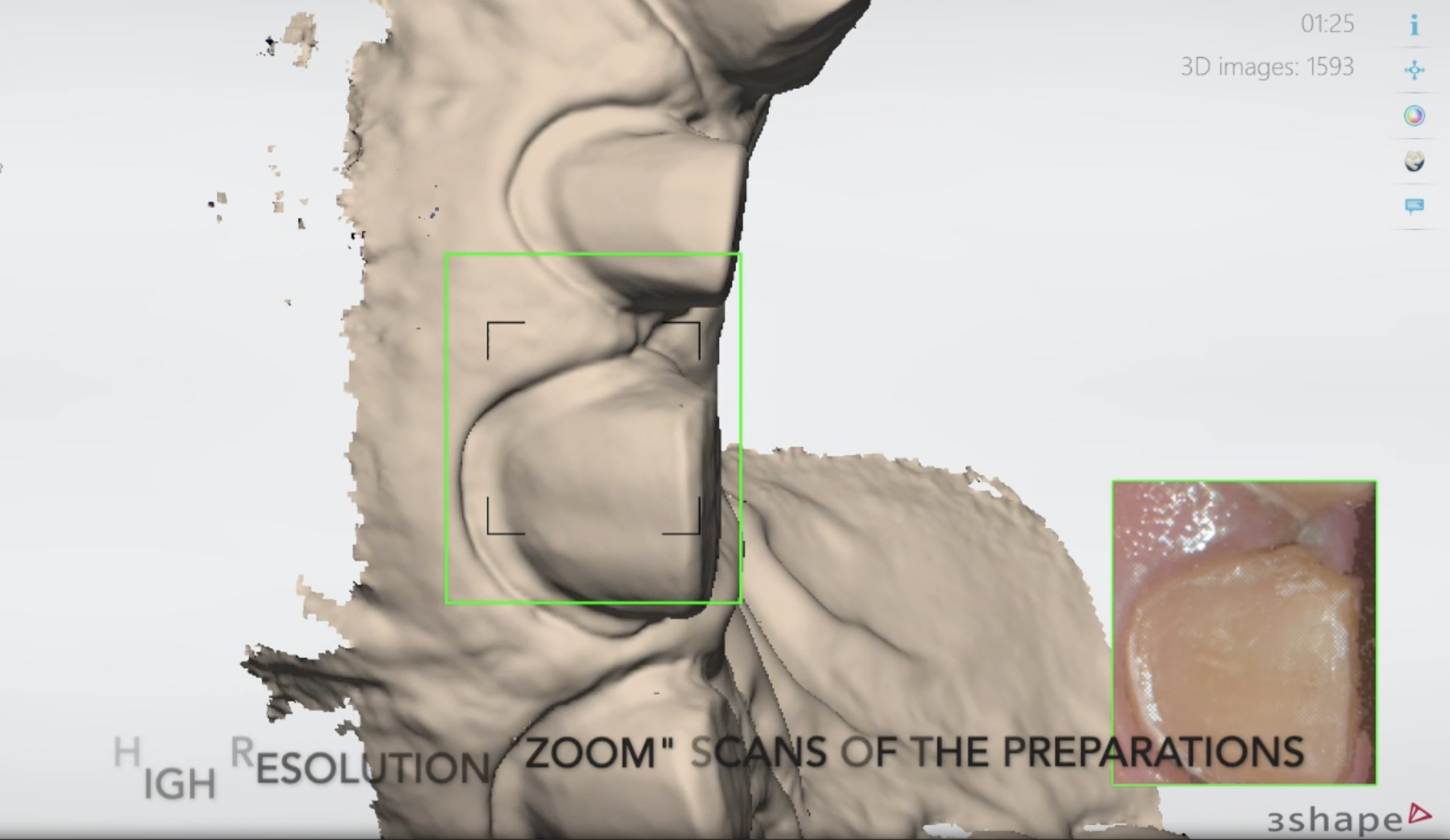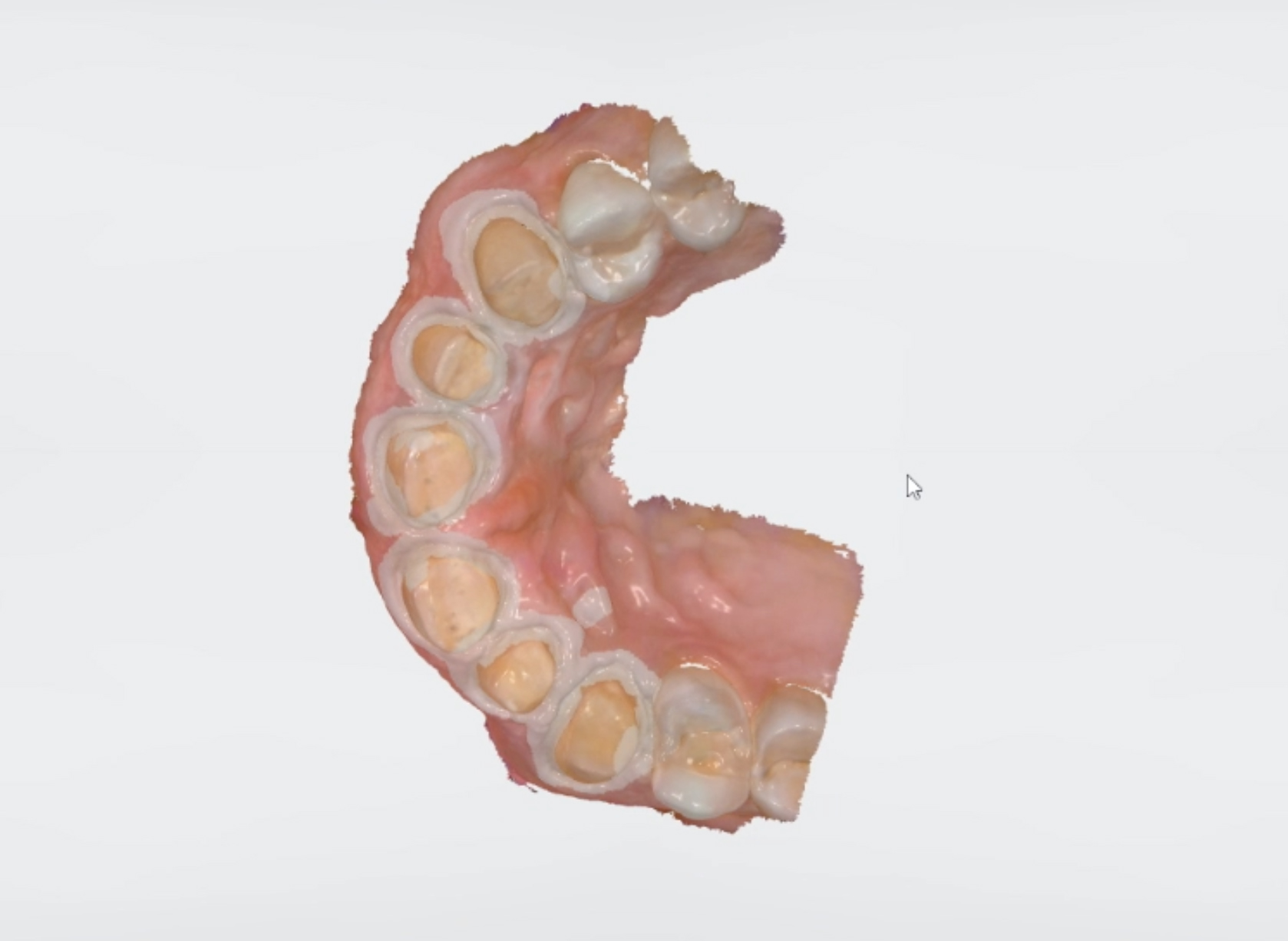 Traditional full-arch or full-mouth impressions of preparations on teeth can be difficult, requiring the isolation of tissues. Flowing light body and regular body impression materials risk introducing bubbles on the margins, which would require the impressions to be taken again. With intraoral digital technology, however, the practitioner can capture a pre-preparation scan of provisionals, capturing the esthetics, occlusion, and all surface features. Once the provisionals have been captured, the practitioner can then remove all of them except for two or three, to be used as reference points. The provisionals that were removed can be trimmed away from the scan, and a scan of the preparations is then completed using the remaining provisionals as a common landmark to initial the scan. After scanning, the practitioner can digitally trim away the remaining provisionals, remove them, and scan those remaining preparations. The practitioner is able to work across the arch two or three preparations at a time, removing retraction cords only from teeth about to be scanned.