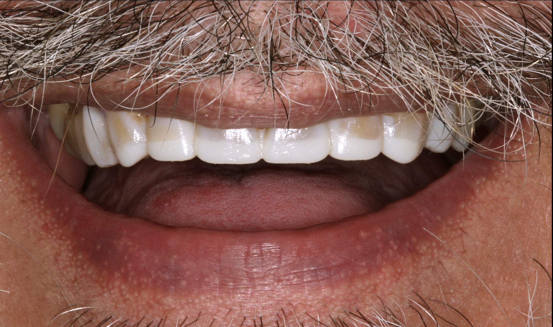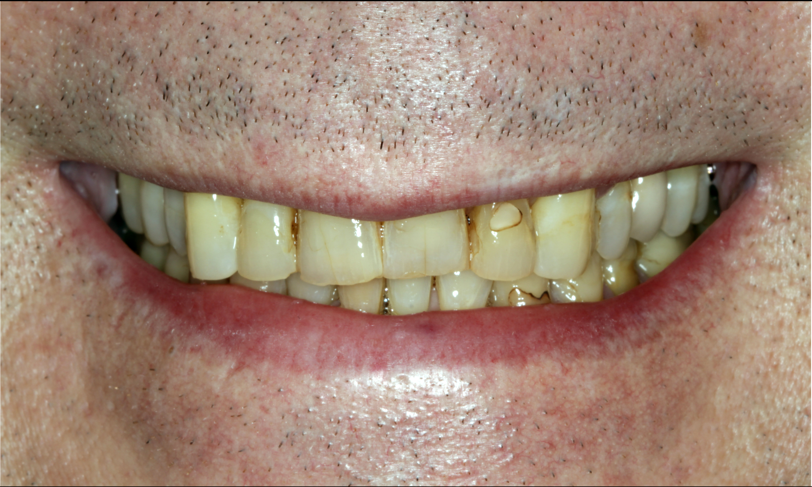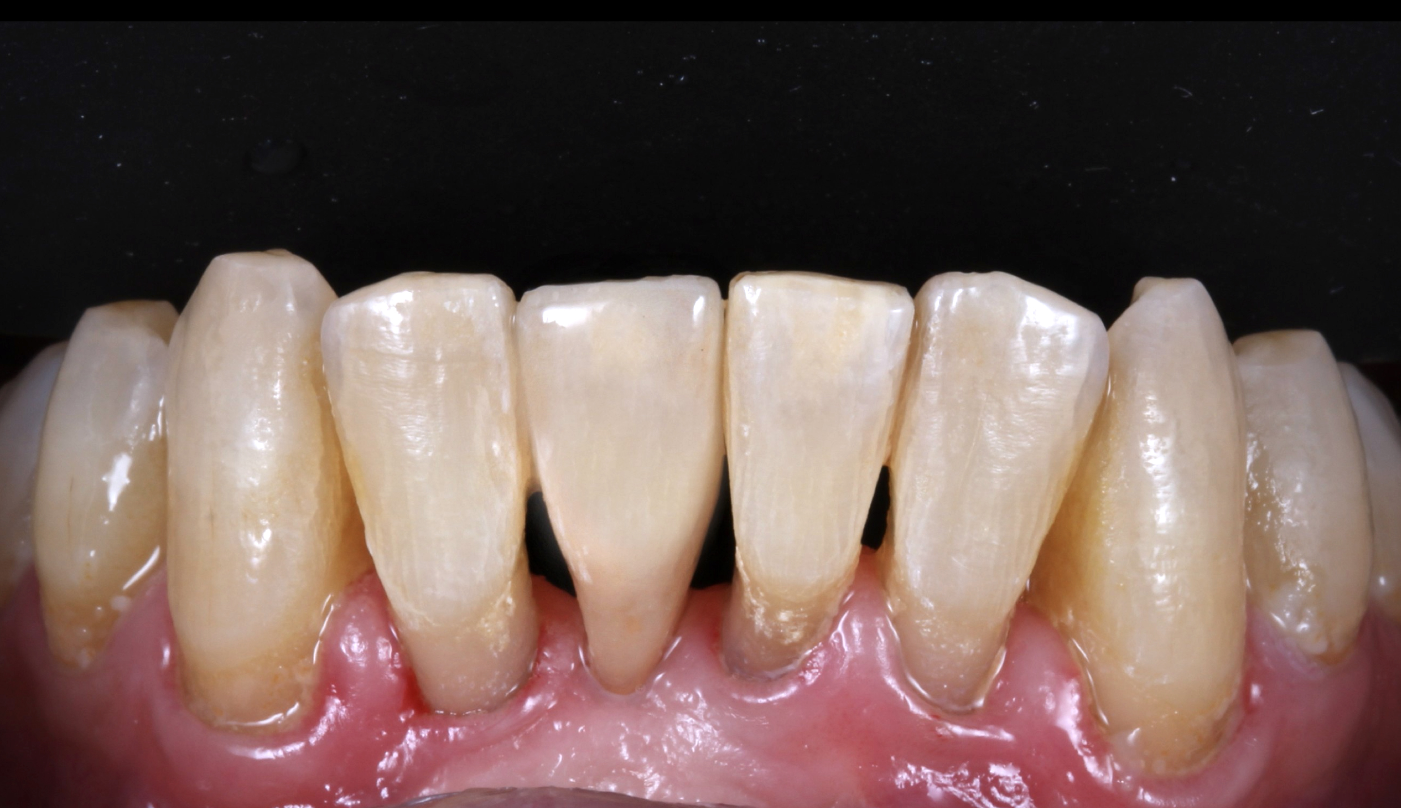 The patient presented with missing mandibular posterior teeth, which led to super-eruption of the maxillary posterior teeth and increased forces on the anterior teeth. This resulted in attrition and wear, shortened maxillary and mandibular incisors, and a reverse smile, as the incisal plane did not follow the curvature of the lower lip (Figure 4). The patient did not show incisal edges in his physiological rest position, and lengthening of the incisors was indicated.8