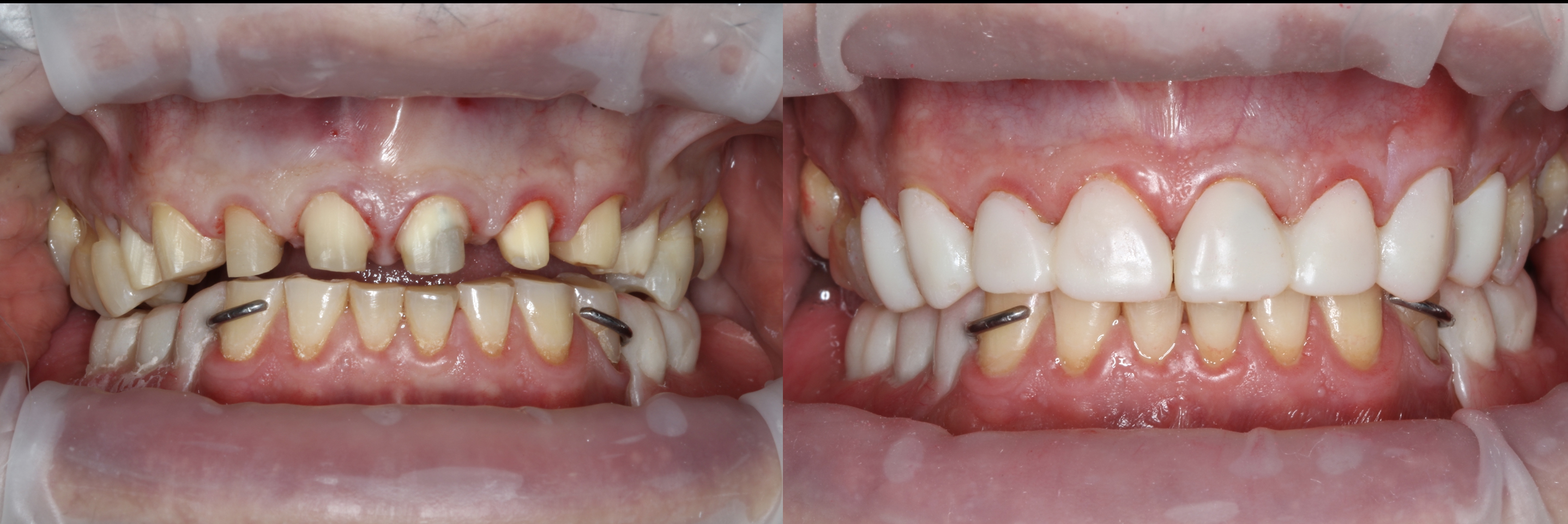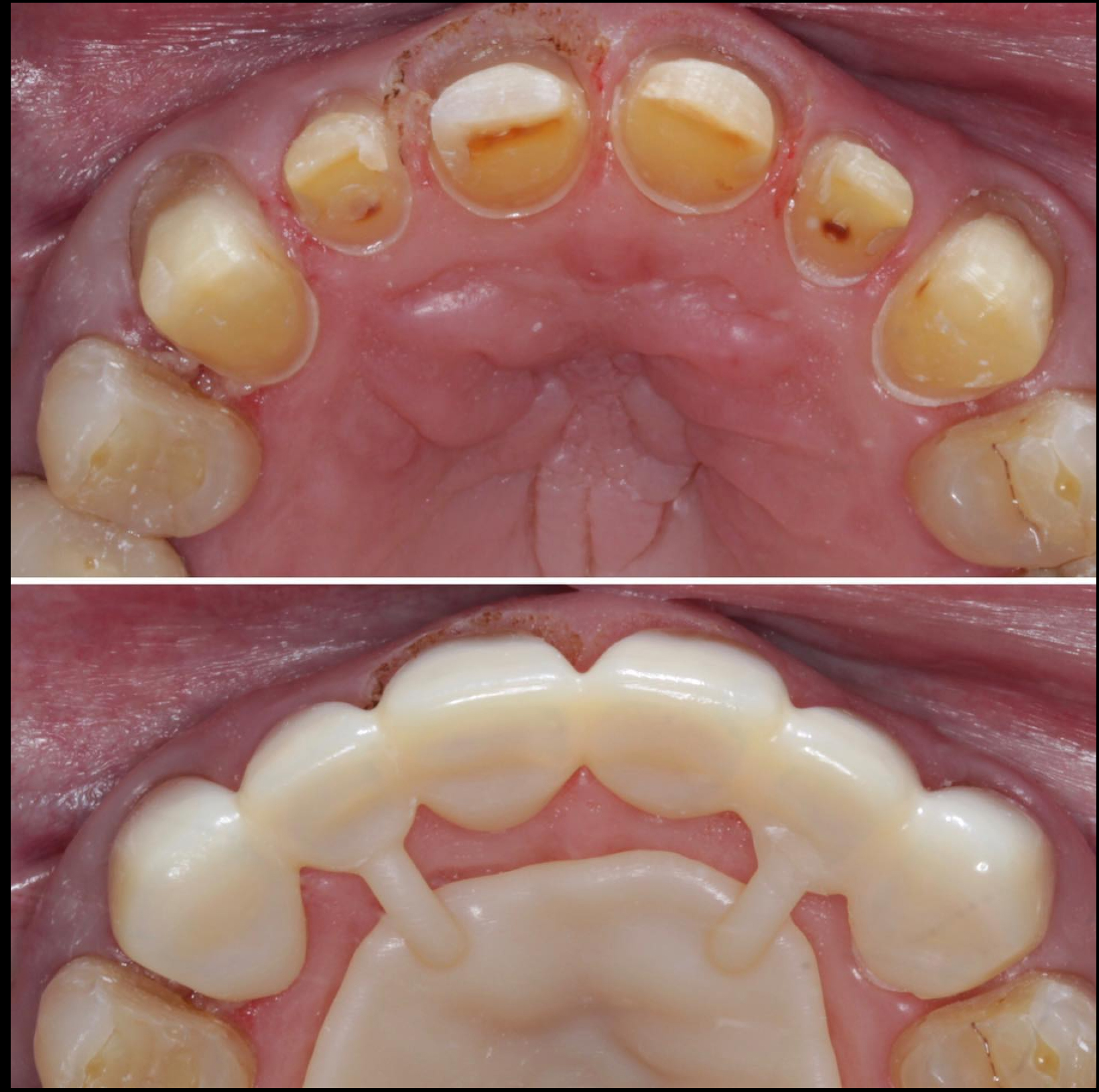 A patient presented with a single roundhouse maxillary bridge, splinted together from molar to molar, which displayed deep, bulky margins. The patient was displeased with the esthetics of the bridge and mandibular teeth due to spacing and the difference in color between the mandibular teeth and the maxillary bridge. The upper bridge was removed and the patient was prepared for a full-mouth reconstruction and put into laboratory-made provisional restorations to confirm esthetics, occlusal vertical dimension, occlusion, and functional movements.