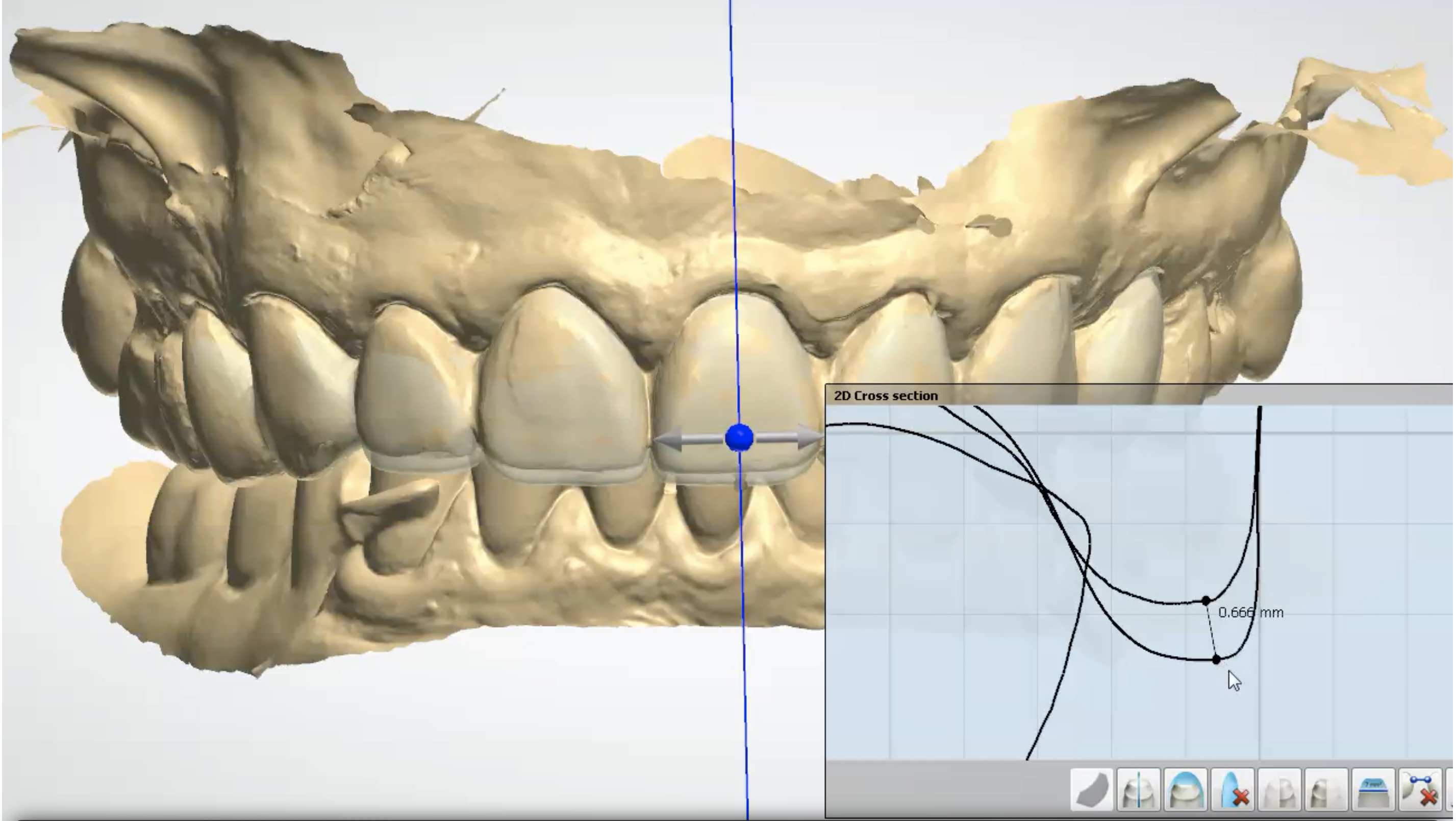 Following conventional protocols, the dentist still created a direct mockup to verify that all was correct before performing irreversible procedures (Figure 6). Figure 7 shows the chairside provisionals at the new vertical dimension based on the laboratory's design. A digital impression of the chairside provisionals can then be taken, and another round of smile design can be done for further improvements when fabricating the long-term polymethylmethacrylate (PMMA) provisionals. Digital technology allowed the practitioner to give the laboratory very specific instructions. Scans of chairside provisionals were overlaid with laboratory designs, allowing measurement of lengthening and shortening to the exact micrometer; in this case, the incisors were lengthened by 0.6 mm and a premolar was shortened by 0.7 mm from the position of the chairside provisionals (Figure 8). Those precise, fine details made a significant difference in the overall quality of the smile and allowed correction of the reverse plane through enhanced communication with both the patient and the laboratory.