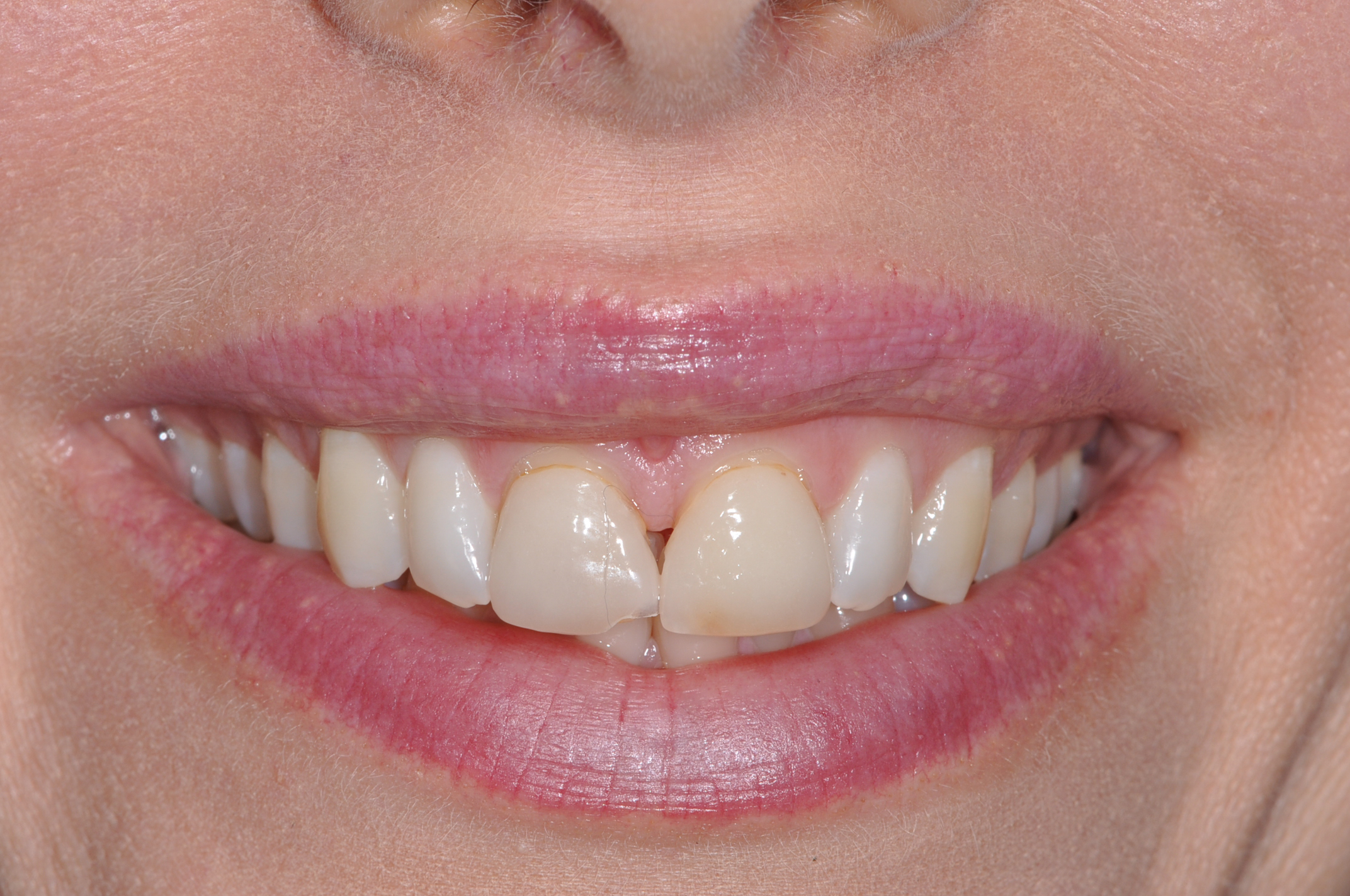 In the next case, the patient presented with a high smile line and with veneers on her central incisors that were too square-shaped, discolored, and chipped (Figure 9). Using conventional methods, the practitioner could do a direct mockup using flowable materials or an indirect mockup based off of a wax-up. Although this technique has been successful, it is time-consuming and lacks a visual tool to facilitate communication between patient and clinician.