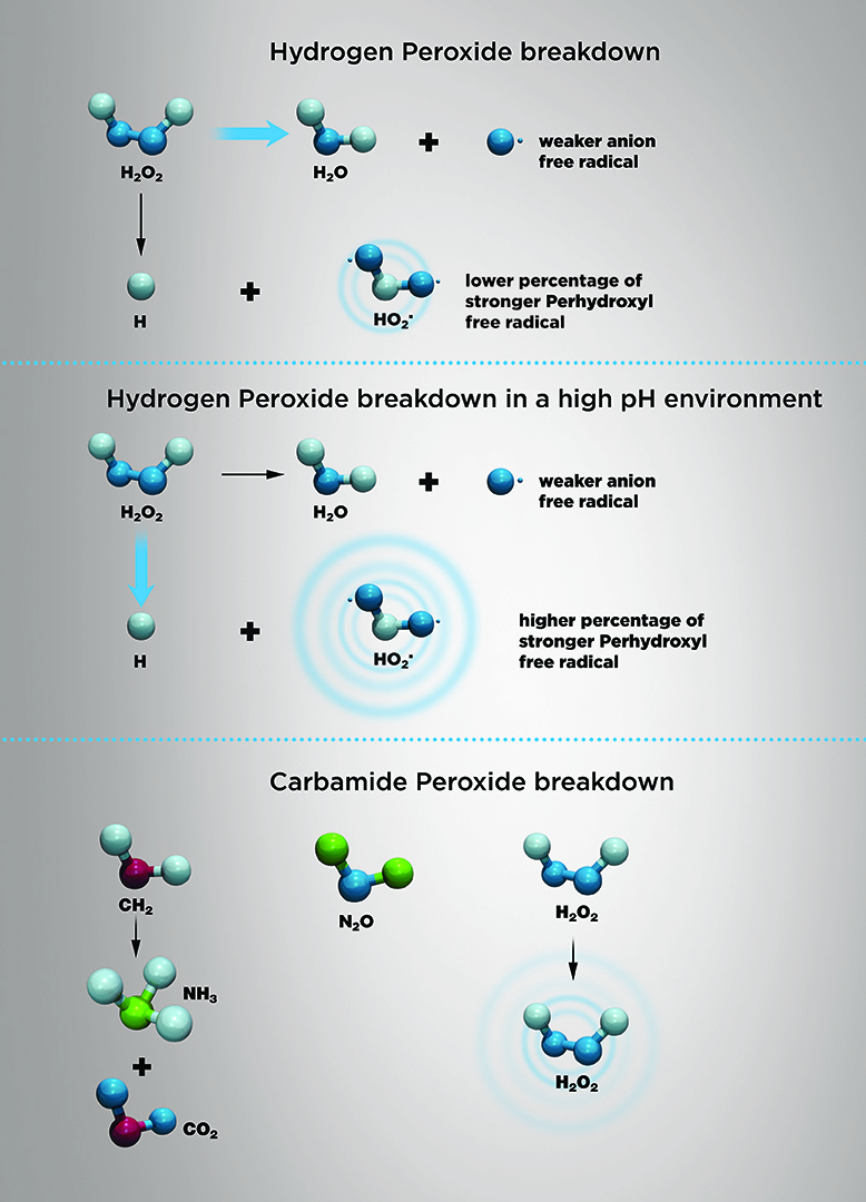 During the teeth-bleaching process, hydrogen peroxide breaks down into water and peroxide radicals (oxygen ions) as it is absorbed through tooth enamel (Figure 1).8 Unstable electrons in these radicals seek to bind with unsaturated double bonds, which are typically dark- or yellow-pigmented, then alter their structure by breaking them down into single carbon bonds and reducing their absorption of light-instead reflecting light and giving teeth a whiter, brighter appearance.7,8