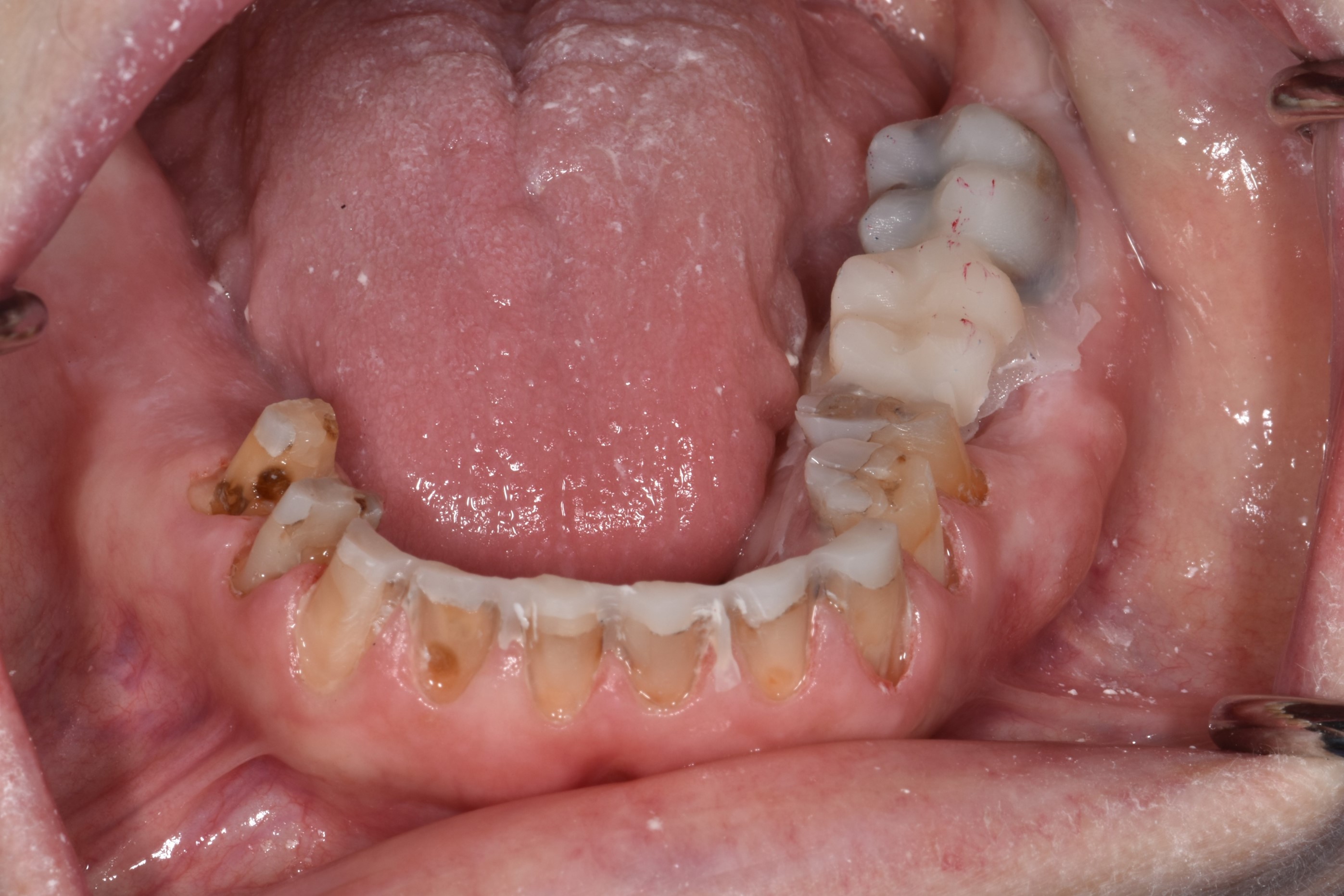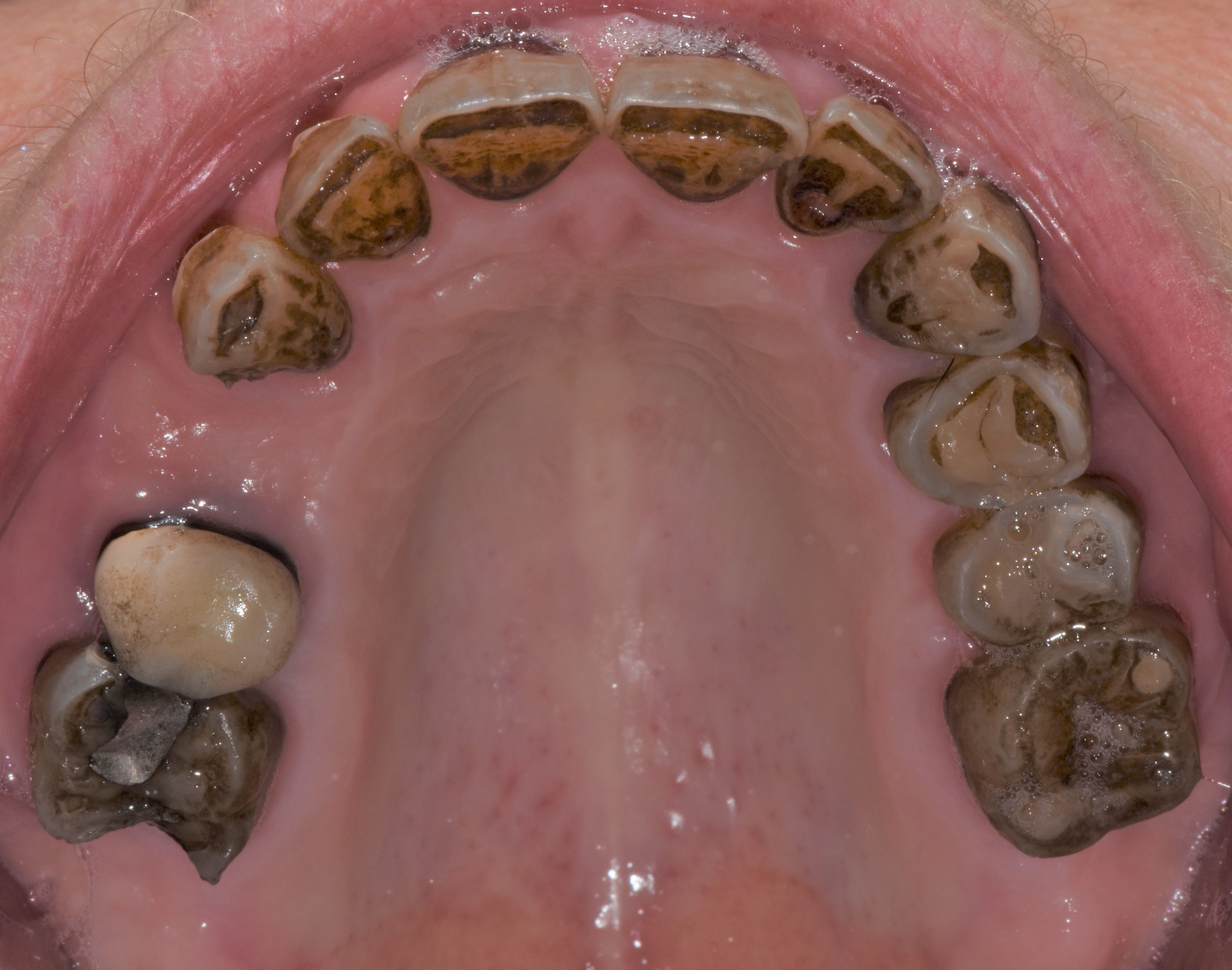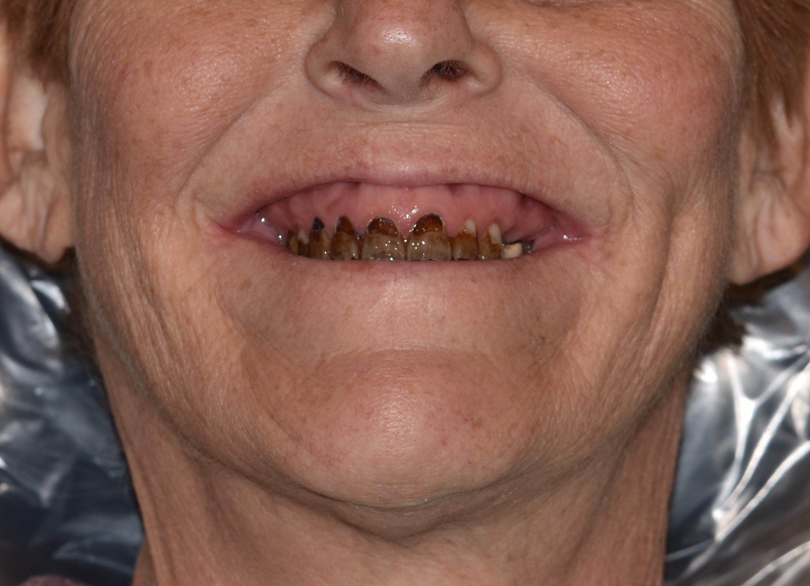 At a clinic treating patients in an underserved population, a 54-year-old female patient presented requesting extraction of all of her teeth and fabrication of dentures for her long-term restorations. The patient had a history of breast cancer, which had been treated with chemotherapy. She believed that full dentures would be an appropriate treatment option for her, owing to the poor state of her oral health and dentition and because she had limited financial resources and did not think that she could afford restoration of her teeth. The patient reported that she had experienced depression and alcohol abuse because of her cancer diagnosis, and that she had neglected her dental care during the course of her cancer treatment, resulting in generalized moderate-to-severe caries with moderate wear due to bruxism (Figure 1 through Figure 5). She also presented with significant staining of her remaining dentition due to the alcohol abuse.