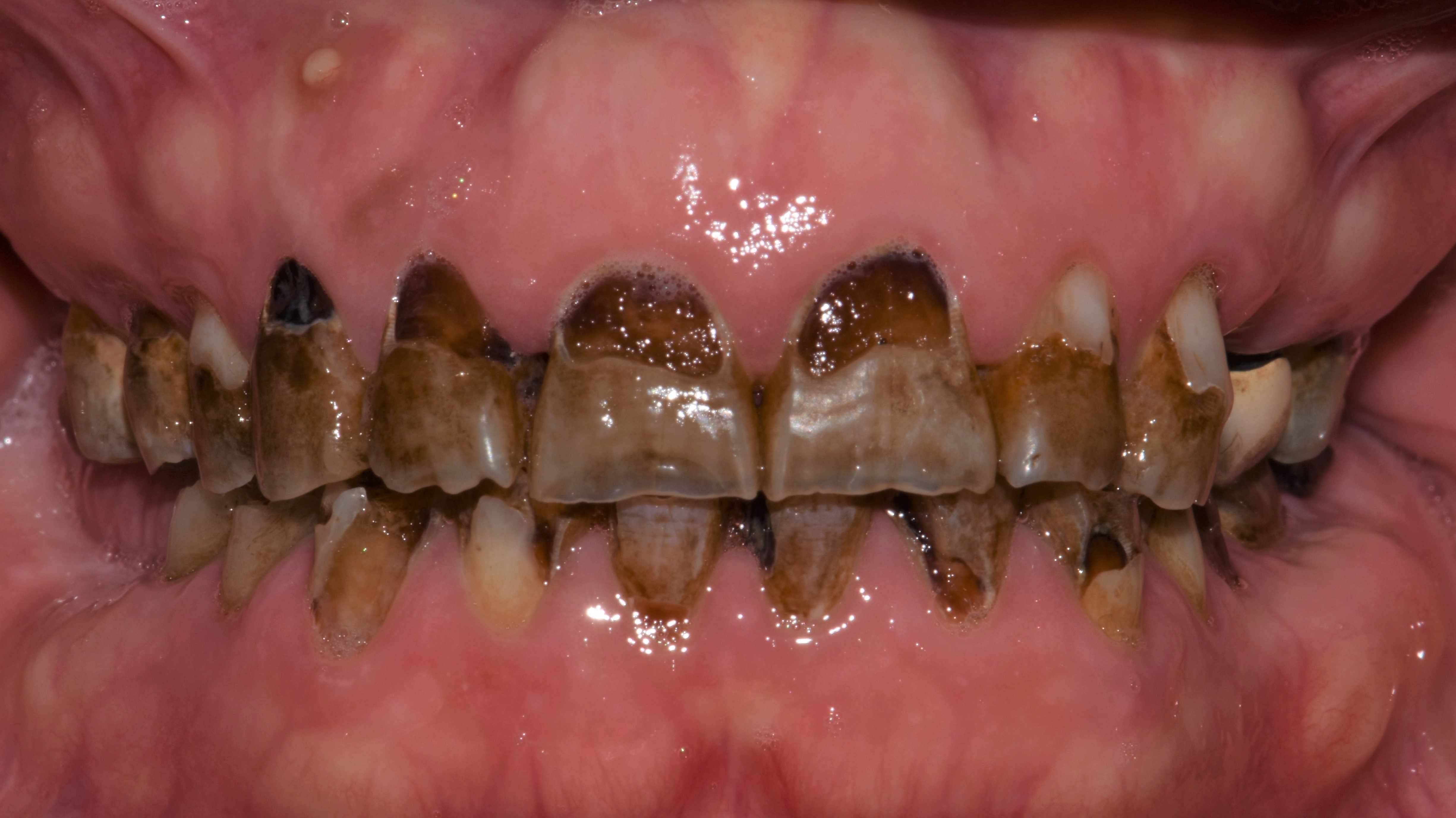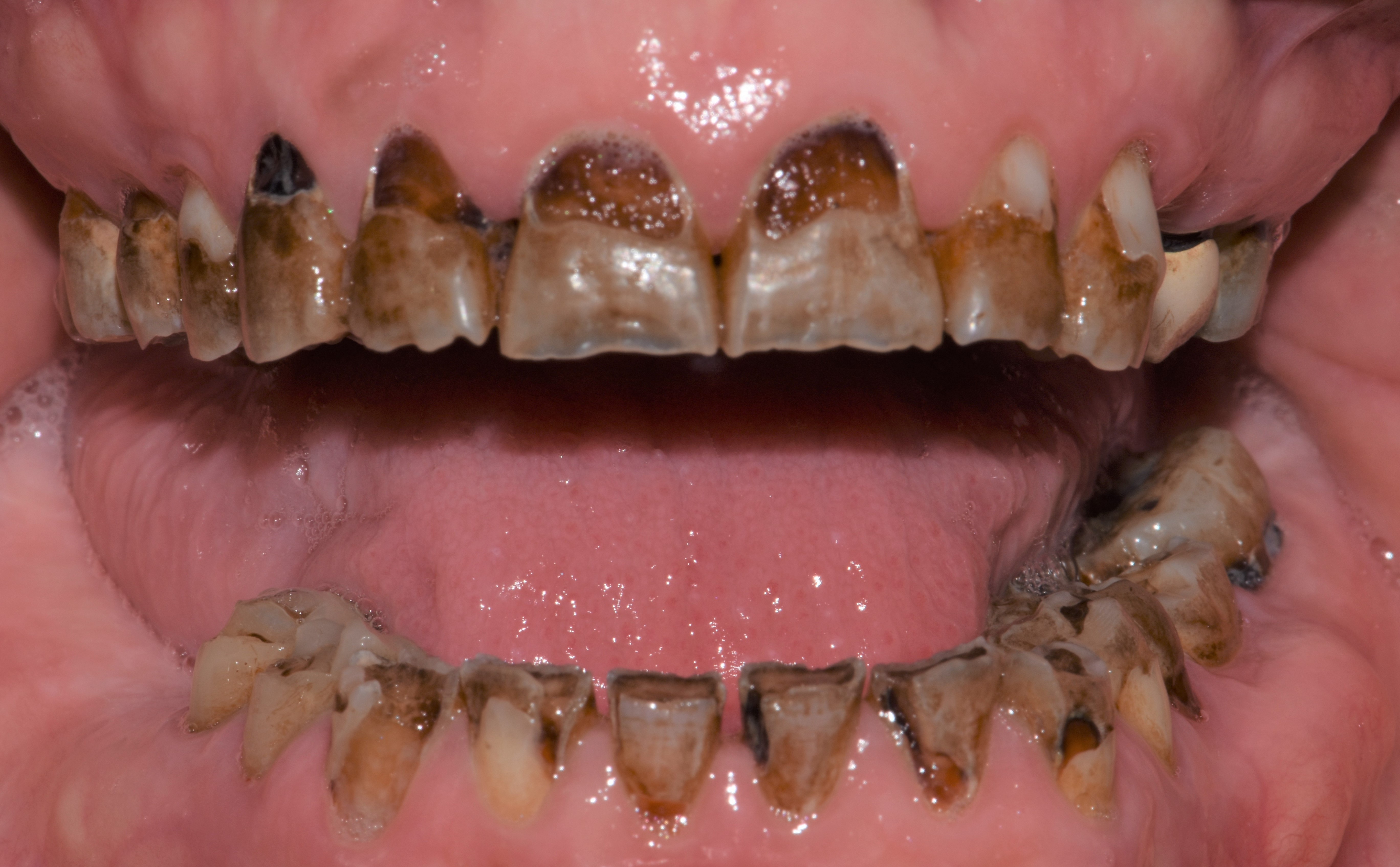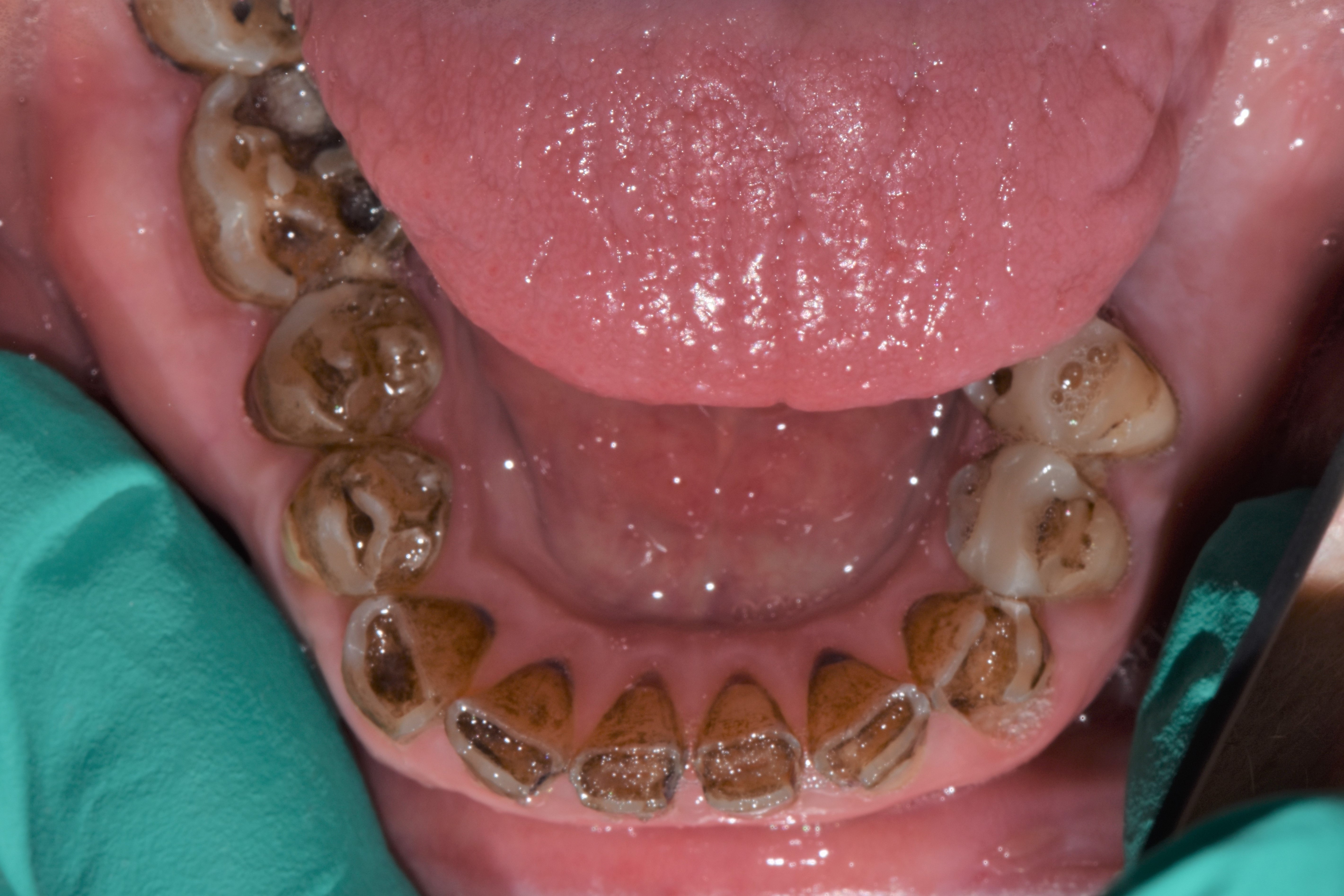 At a clinic treating patients in an underserved population, a 54-year-old female patient presented requesting extraction of all of her teeth and fabrication of dentures for her long-term restorations. The patient had a history of breast cancer, which had been treated with chemotherapy. She believed that full dentures would be an appropriate treatment option for her, owing to the poor state of her oral health and dentition and because she had limited financial resources and did not think that she could afford restoration of her teeth. The patient reported that she had experienced depression and alcohol abuse because of her cancer diagnosis, and that she had neglected her dental care during the course of her cancer treatment, resulting in generalized moderate-to-severe caries with moderate wear due to bruxism (Figure 1 through Figure 5). She also presented with significant staining of her remaining dentition due to the alcohol abuse.