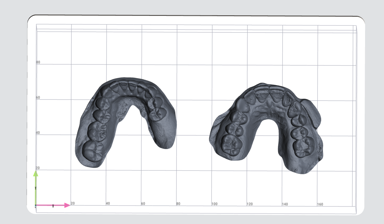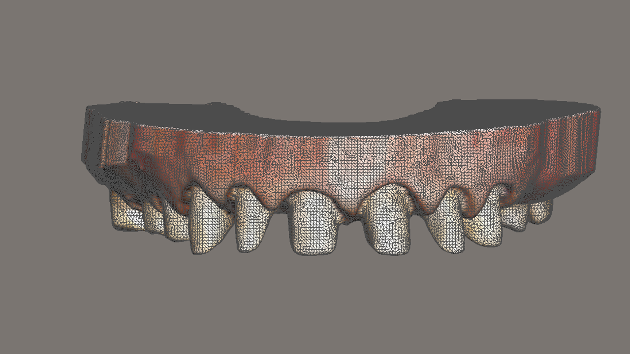 After a dental prophylaxis cleaning, the patient's mouth was scanned with an intraoral scanner for preoperative models (Figure 6). An upper and lower dentate scan was obtained with corresponding bite records. The bite was recorded at maximum intercuspation. Tooth length measurements were made, and it was found that the maxillary central incisors were only 8 mm in length, owing to prolonged bruxism and incisal wear.