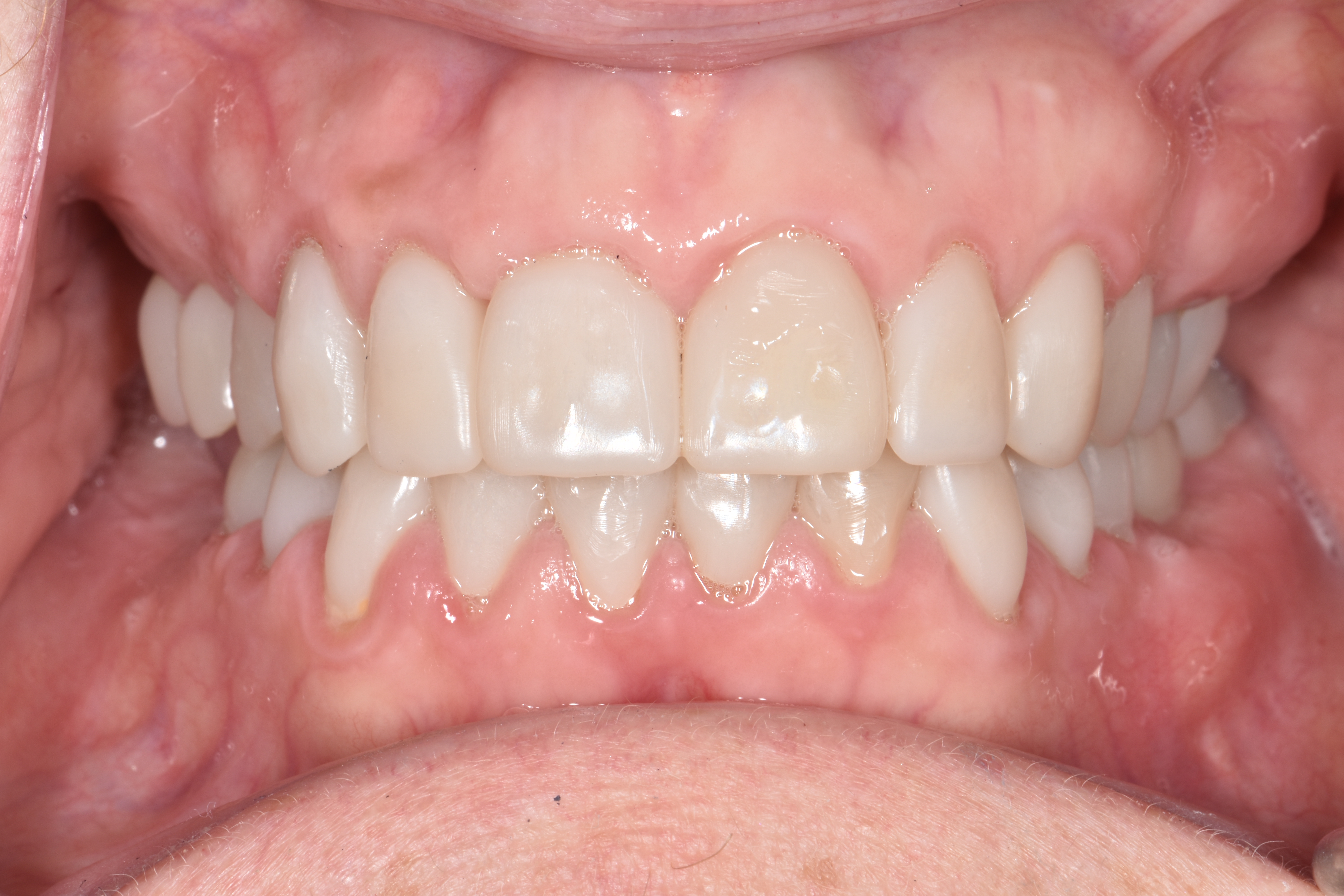 After clinical evaluation and treatment planning, it was determined that the state of the patient's dentition was not hopeless and that her teeth could be restored. The patient decided that she would like to try to preserve her natural teeth with a full-mouth crown and bridge rehabilitation, and to have any salvageable teeth treated with root canal therapy instead of extraction, if possible. After a thorough examination, it was determined that one tooth would need to be extracted (tooth