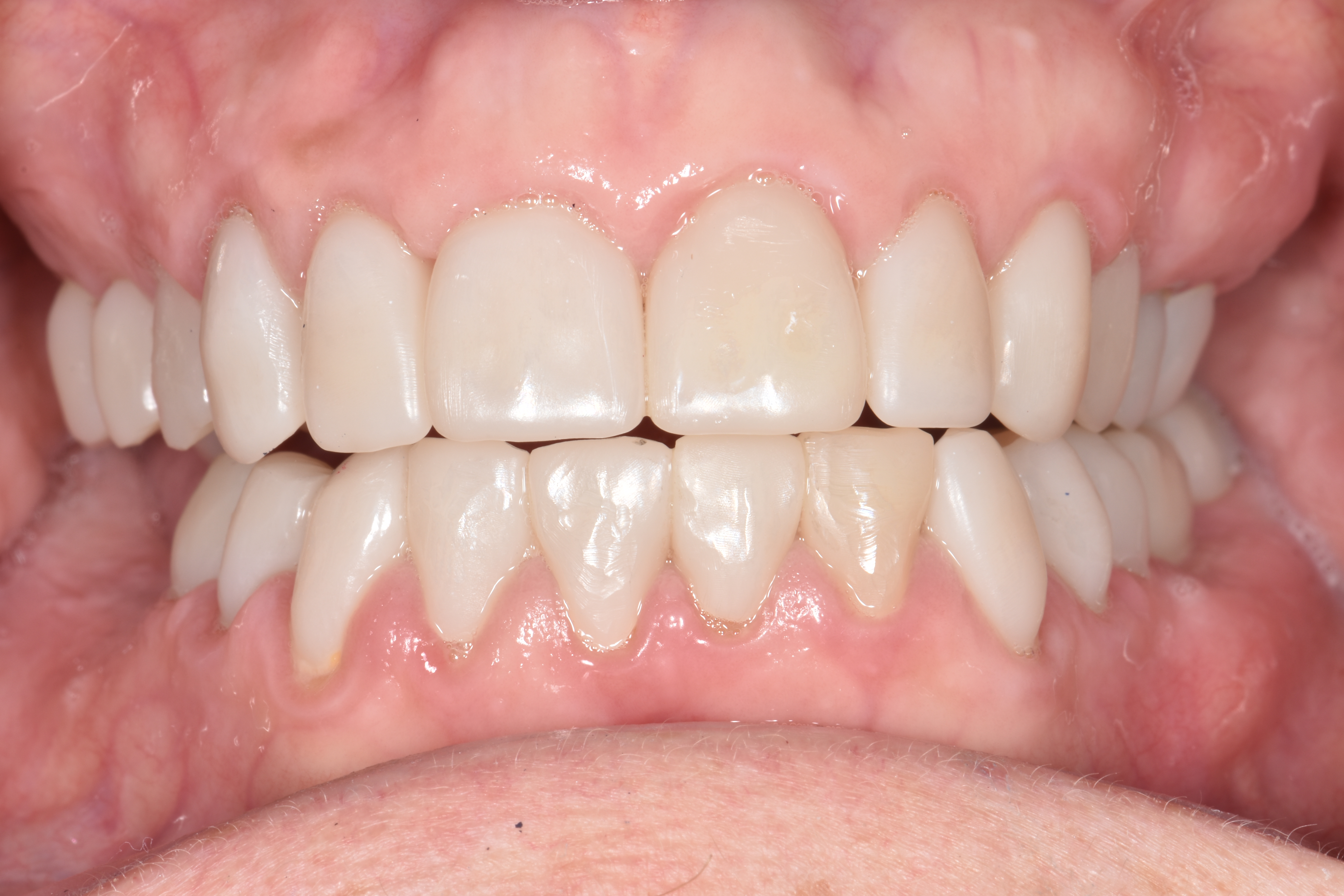 Once the existing decay was treated, the ideal wax-up was transferred to the patient's mouth via a putty matrix and tested for occlusal harmony and patient comfort using a bis-acryl temporary crown material (Figure 10). The patient wore the temporary ideal wax-up for 2 weeks, and occlusal adjustments were made where necessary to calibrate the occlusion. The patient reported that she was satisfied with the function and esthetics of the ideal wax-up, and the teeth were then prepared, starting with the lower arch.