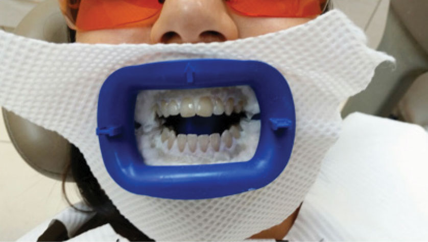 Utilizing an open mouth isolation technique during teeth whitening (Figure 1) can lead to dehydration of the teeth and significant post-treatment tooth sensitivity. The dehydration effect has been found to occur when a rubber dam is used to isolate the teeth for an hour or more,19 which is the approximate duration of standard in-office whitening treatments. The use of intense light exposure (heat generated by the light) has also been noted to increase dehydration.19 In addition, in a study comparing a chemically activated teeth-whitening treatment with a light-activated treatment, it was reported that light activation did not increase the whitening result.24