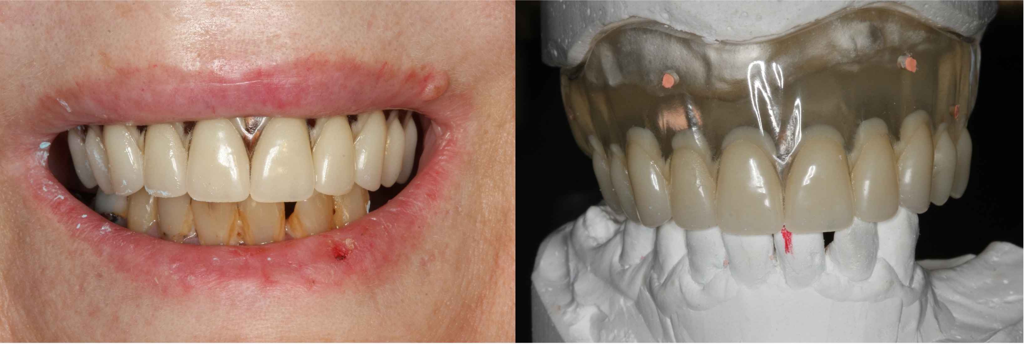 Autogenous bone mixed with PRP was used to graft the deficient sites. Then, PRF membranes (Figure 6) were used to cover over the autologous bone graft and a buccal fat pad graft was overlaid on the right zygomatic implant to prevent mucosal dehiscence and mucosa complications (Figure 5, right panel). The patient's existing denture was converted chairside into a temporary hybrid screw-retained prosthesis (Figure 8). Approximately 3 months after the provisional hybrid was placed, the buried implant Nos. 6 and 11 were uncovered and multi-units were placed on them. The prosthodontist was able to incorporate all six implants into the final fixed hybrid zirconia prosthesis.