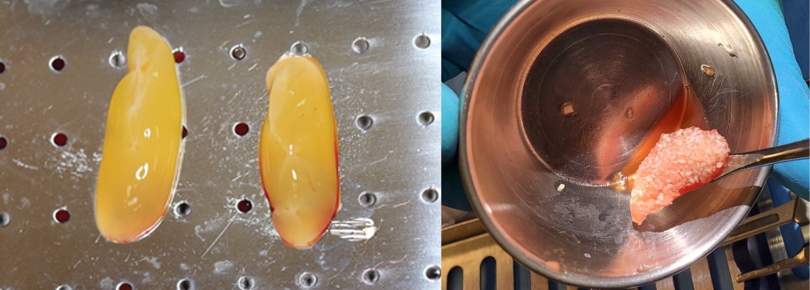 Platelet rich fibrin (PRF) membranes are also made and can be placed on top of the autogenous bone graft. Several PRF membrane protocols are reviewed in the literature.22 The protocol that the author uses is 1,300 RPM x 8 minutes using Red Cap, BD glass tubes23(Figure 6). The difference between PRP and PRF is that during PRF processing, a fibrin clot (scaffold/matrix) is allowed to form. Therefore in the "membrane" form, growth factors are released slowly into the surgical site (typically factors are released for up to 7 days).21,24