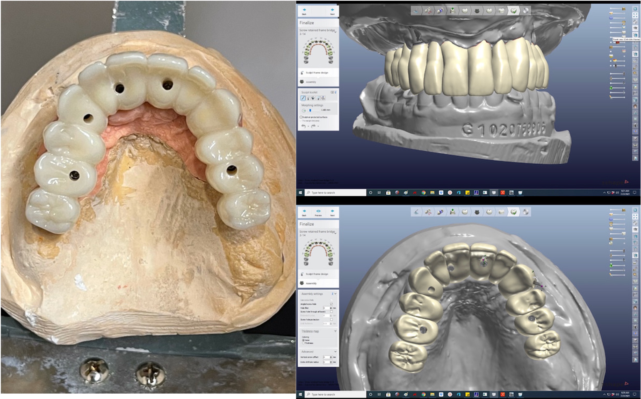 Prosthetic-level planning was carried out, and the surgery was performed free-hand. The plan was to place five endosseous implants and one zygomatic implant and immediately load the case if criteria were met (insertional torque values of each implant greater than 45 Ncm each) (Figure 2).