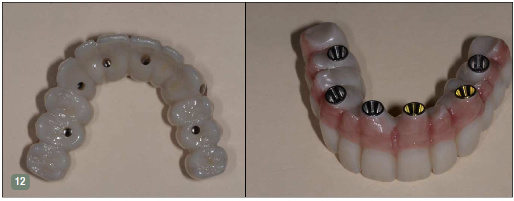 Fortunately, with the benefit of cross-arch splinting, proper anterior-posterior spread, appropriate hygiene, and occlusal control and restorative space, complications with the full-arch fixed hybrid prosthesis are uncommon. If the above principles are adhered to and proper maintenance protocols are in place, then a compliant, nonsmoking, nonimmunocompromised patient with good oral hygiene will benefit from a long-standing, trouble-free restoration.