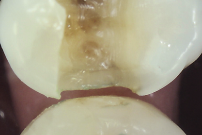 Once a significant asymptomatic enamel crack is diagnosed, to determine its extent the crack is exposed and traced using a minimally invasive exploratory fissurotomy as well as caries removal and/or existing restoration removal whenever indicated (Figure 6 and Figure 7).2,3,17 If the crack is limited to enamel and does not extend into dentin, it can be completely eliminated and treated similarly to caries whereby the condition of the remaining tooth structure dictates the type of the restoration placed and the materials used (Figure 8). For example, moderate-sized cavity preparations can support bonded direct intracoronal resin-based composite restorations (Figure 9).25 This is generally interpreted as cavity preparations in which the isthmus width is less than 50% of the intercuspal distance and the remaining enamel is sound and well supported by dentin. Occlusal adjustment, including removal of excursive interferences, might also be necessary to eliminate localized heavy occlusal forces that are predisposing the tooth to cracking.10,19,26Occlusal guards also can be fabricated to protect teeth from the damage caused by on- going bruxism.19