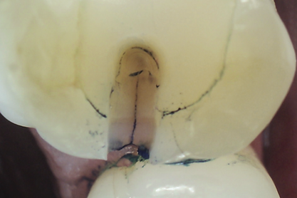 Methylene blue dye is the most commonly used dye to stain cracks because of its pooling tendency.2,3,14,16,17,23 The dye pools into the enamel and dentin cracks, and the tooth is thoroughly rinsed. The resulting dark stain retained in the crack lines then helps enable cracks to be detected (Figure 4 and Figure 5). Methy- lene blue dye, however, also stains dental plaque, requiring the tooth surface to be cleaned with pumice or prophylaxis paste before dye application.14 The dye also can be absorbed by dentin, but any residual dye can be removed using a 10-second phosphoric acid etch.14 A comparative study of dye staining and trans- illumination concluded that methylene blue dye staining and transillumination performed simultaneously is the optimal crack assessment technique.23