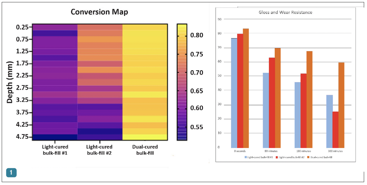 Depth of cure depends on filler type, size, and loading, among other factors.8 Polymerization kinetics and their depth variation for dual-cured bulk-fill composites are material dependent.12In Wang et al's study of polymerization kinetics in dual-cured and light-cured bulk-fill composites, two dual-cured composites exhibited faster polymerization kinetics at the 0.5 mm depth than at the 5.0 mm depth, whereas another dual- cured bulk-fill composite possessed moderately paced kinetics at both the 0.5 mm and 5.0 mm depths.12This could account for its uniform depth of conversion, as shown in Figure 1 (J. Ferracane Oregon Health & Science University School of Dentistry; unpublished data, 2022).