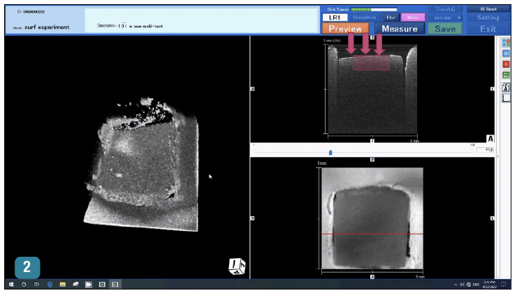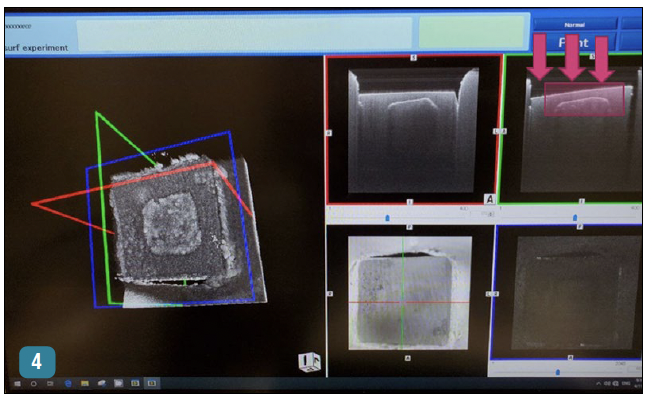 Another study revealed that dual-cured bulk-fill composites did not reduce gaps in margins compared with light-cured bulk-fills.6However, in a presentation at the IADR general session in San Francisco in 2017, Dr Michael Miller showed that with one bulk-fill composite, gap reduction was accomplished simply by using a 19-gauge needle as opposed to a 17-gauge needle. The percent of voids at margins went from 0.168 to 0.017, a significant reduction.13 In an additional report, Dr. Alireza Sadr used optical coherence tomography analysis to determine gap formation of five composites (Sadr A. Performance of an improved dual cure bulk-fill composite in adaptation under high C-factor. University of Washington School of Dentistry; unpublished data, 2022). The dual-cured bulk-fill composite had 100% adaptation to the cavity floor and no gap formation in a high C-factor preparation (Figure 2 and Figure 3). A light-cured bulk-fill composite, on the other hand, had 100% separation, most likely due to its self-etching/self-adhesive light- cured formulation (Figure 4).